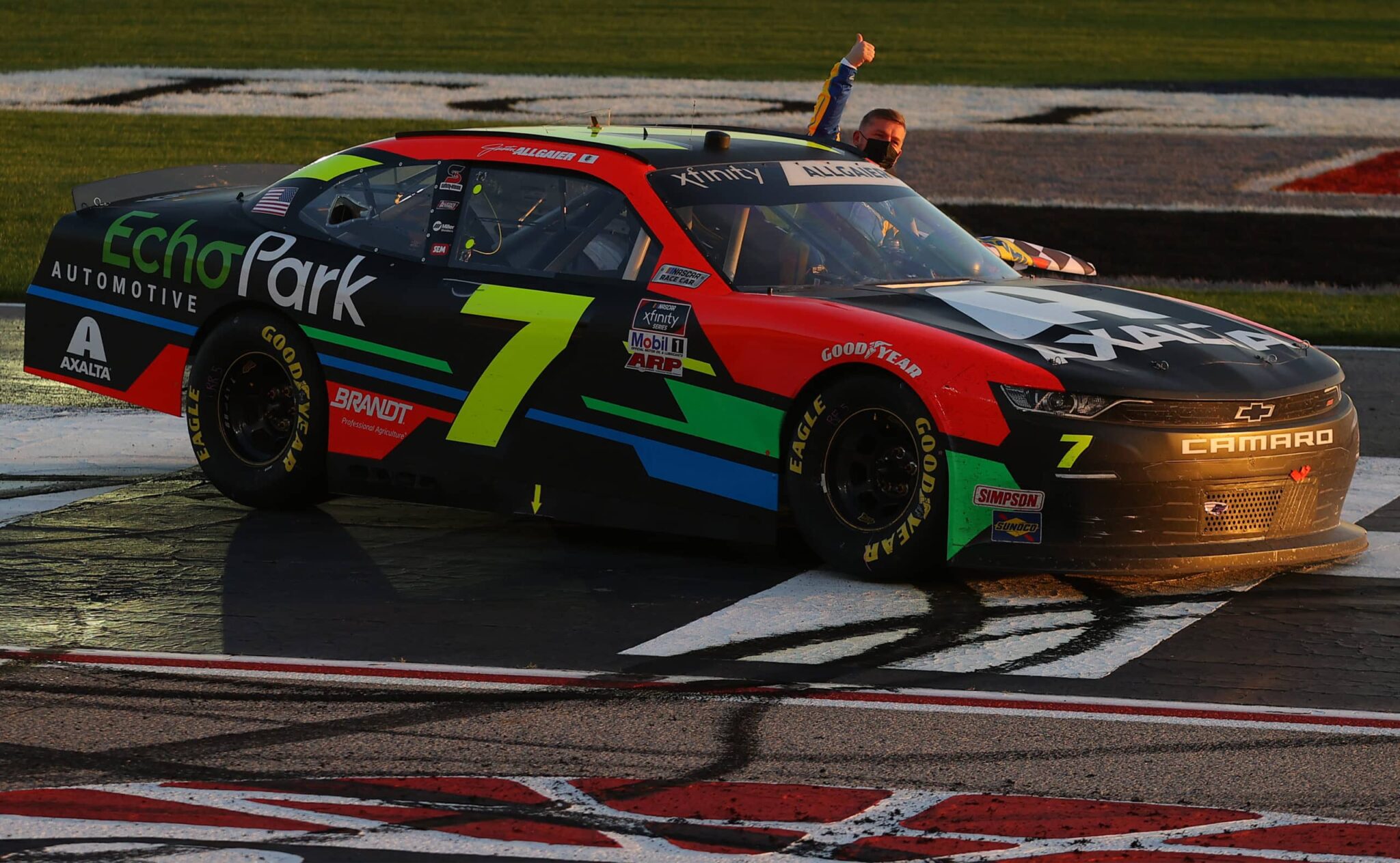 Alors que Martin Truex Jr. avait la main mise sur la course une pénalité a tout changé. Contraint à remonter le peloton, Martin Truex Jr. doit s’incliner dans les derniers tours. En effet, Justin Allgaier a pris les commandes lors de la pénalité de Martin Truex Jr. au tour 114. Dès lors le pilote de la JR Motorsports ne cède pas face au jeune Harrison Burton. Dans les derniers tours, Justin Allgaier résiste au retour de Martin Truex Jr.
