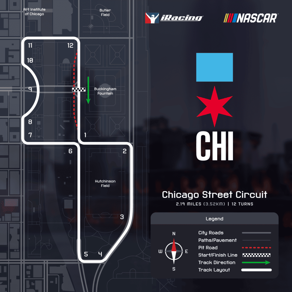 La NASCAR et iRacing ont travaillé pour proposer un circuit urbain dans les rues de Chicago. Ce tracé passera par Grant Park et au nord du Soldier Field, le stade des Chicago Bears. Le tracé empreinte quelques-unes des artères les plus connues de la plus grande ville de l’Illinois. Lake Shore Drive, Michigan Avenue et Colombus Avenue sont ainsi au programme de ce tracé 2,19 miles et 12 virages.