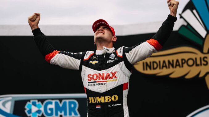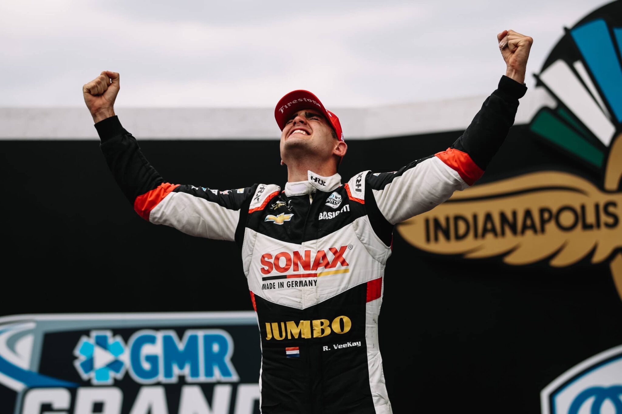 Rinus VeeKay remporte sa première victoire en NTT IndyCar Series ce samedi jour du GMR Grand Prix sur l’Indianapolis Motor Speedway.