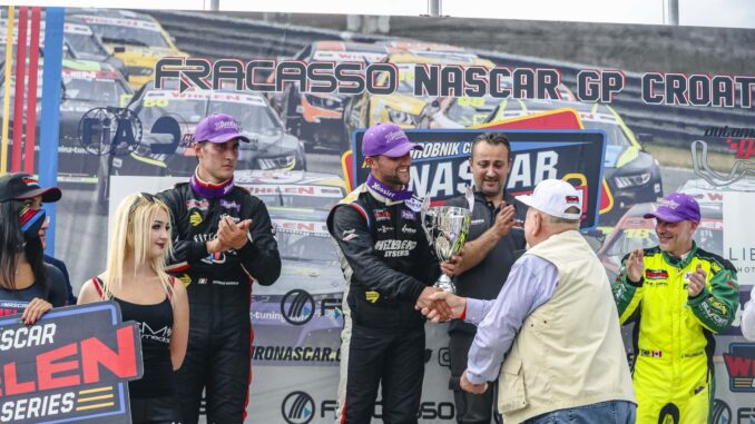 Après 17 tours passionnants de la 7e manche de l’EuroNASCAR PRO à l’Automotodrom de Grobnik, c’est le deuxième pilote à franchir la ligne d’arrivée qui a remporté la course. Une pénalité pour Gianmarco Ercoli en raison d’une infraction au départ a fait de Loris Hezemans le vainqueur. Le Néerlandais a remporté sa quatrième victoire de la saison et a accru son avance au championnat NASCAR Whelen Euro Series. Son coéquipier Vittorio Ghirelli a terminé deuxième, tandis que l’ancien champion de Formule 1 Jacques Villeneuve est monté sur le podium pour la première fois en 2021.