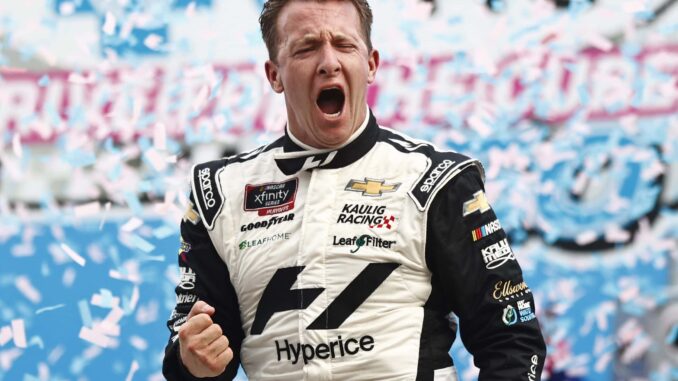 Pour la troisième fois de rang AJ Allmendinger s’impose sur le Charlotte Motor Speedway Road Course en NASCAR XFINITY Series. Le pilote de la Kaulig Racing comptait neuf secondes d’avance à cinq tours du drapeau à damier, lorsuq’une dernière neutralisation est venue tout relancer.