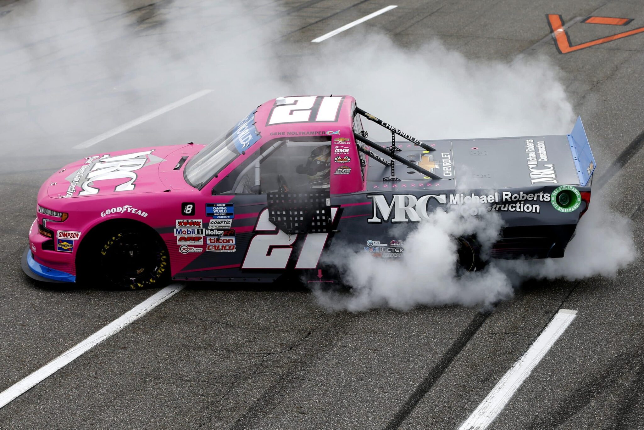 À quinze tours du drapeau à damier Matt Crafton évite le pire, lorsqu’il part en tête-à-queue après une poussette de son coéquipier Grant Enfinger. Sheldon Creed fait également partie des pilotes impliqués dans l’accident.