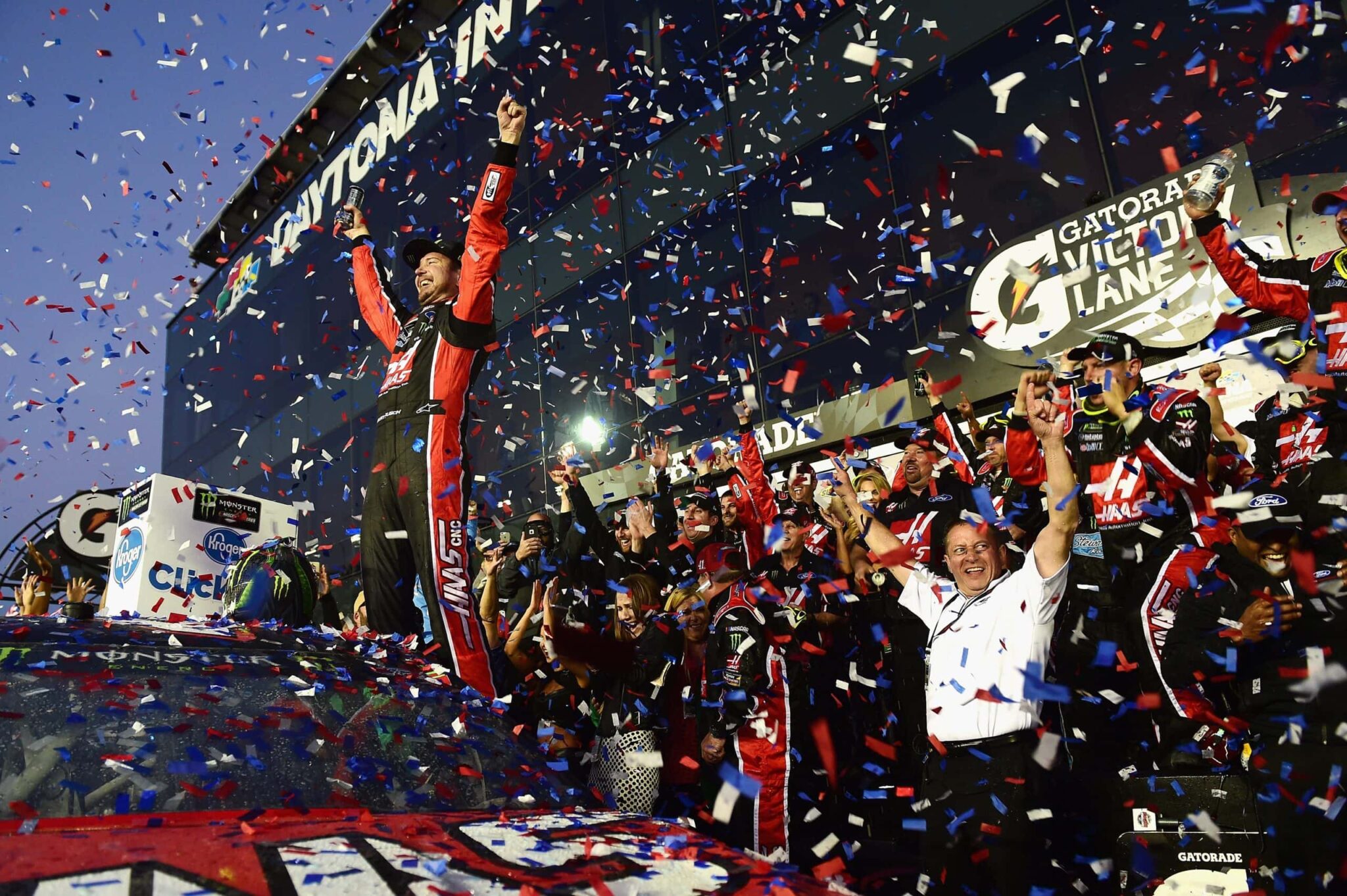 Kurt Busch remporte les Daytona 500. Il s’agit de sa première victoire sur un ovale à plaques. C’est aussi la première victoire pour la Stewart-Haas Racing depuis qu’elle est passée de Chevrolet à Ford.