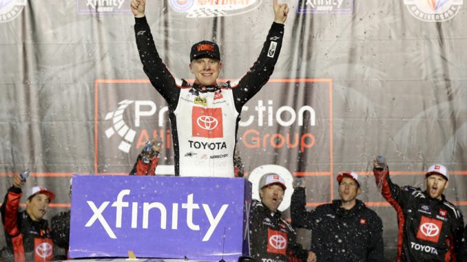 La Cup devait clôturer l’histoire de l’Auto Club Speedway dans sa version de deux miles, mais la météo en a décidé autrement. Reportée de samedi à dimanche, c’est donc la XFINITY qui s’est déroulée après la Cup ce dimanche soir en Californie. Dans ces conditions, l’histoire retiendra John Hunter Nemechek comme dernier vainqueur à Fontana sur l’ovale de deux miles. Cette piste à une valeur particulière pour John Hunter Nemechek, puisque c’est à Fontana, que son père, Joe, a décroché sa toute première pole en NASCAR Cup Series, à l’occasion de la première course sur cette piste, en 1997.