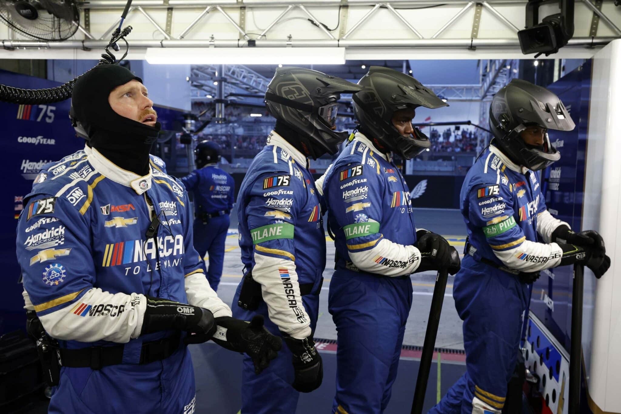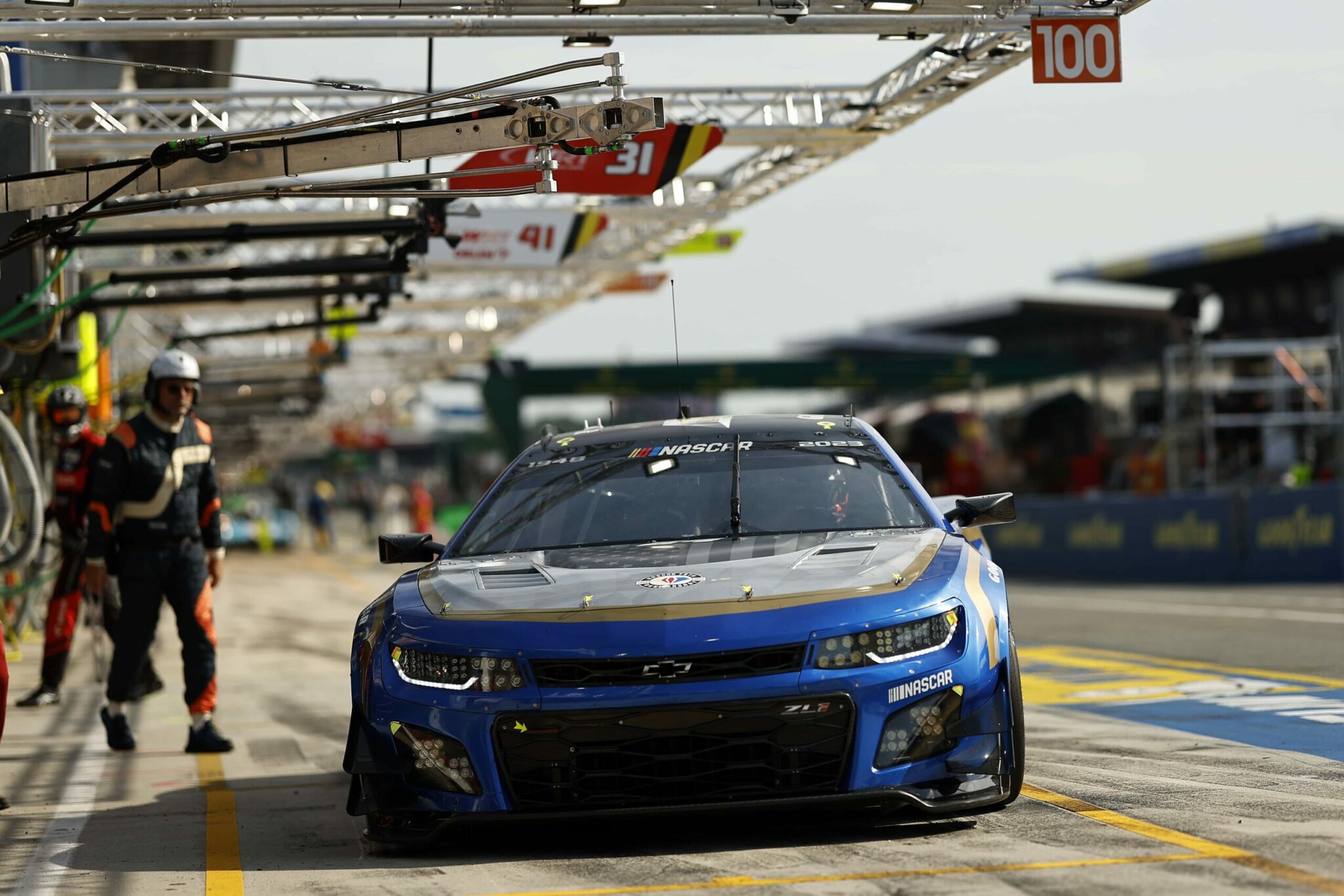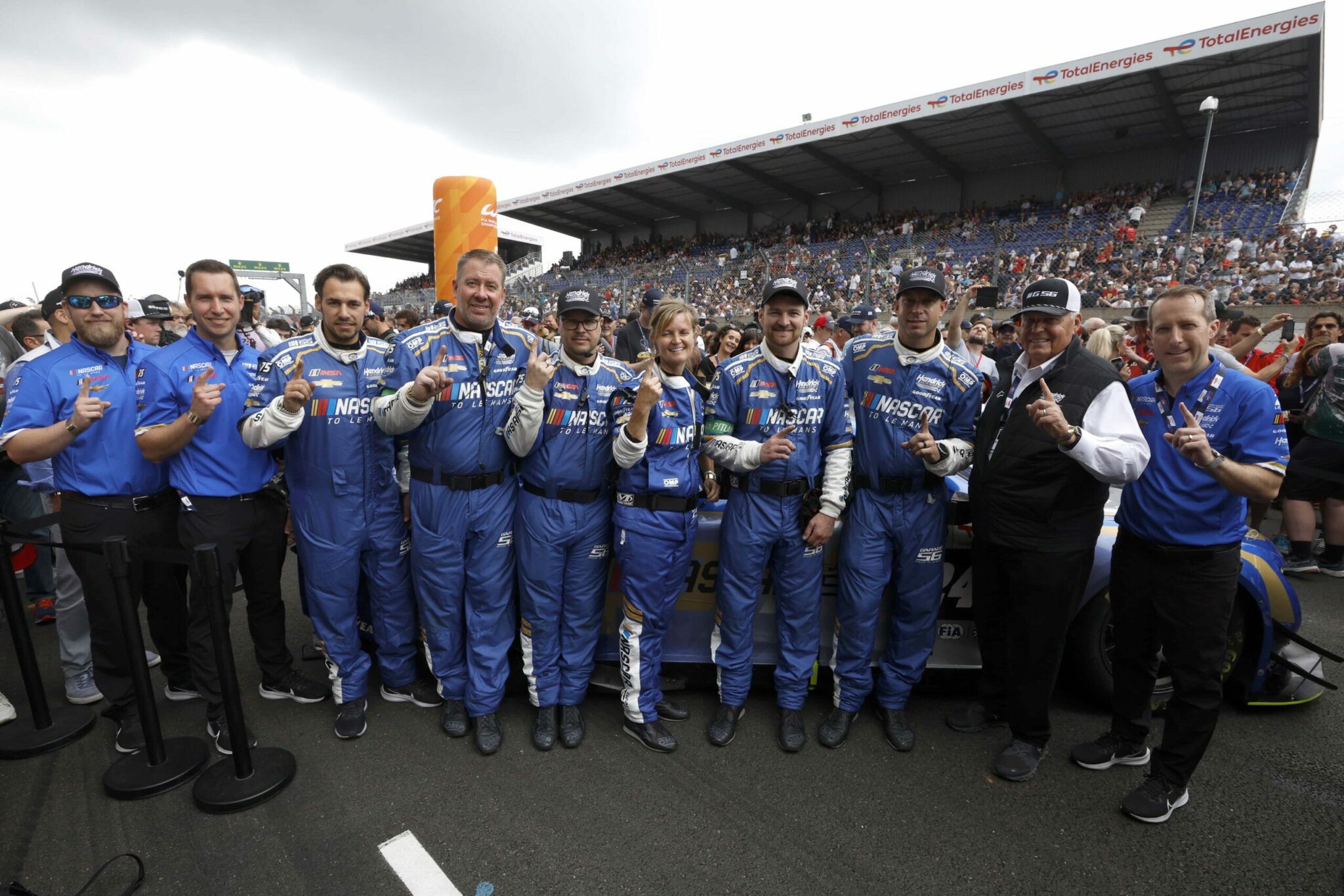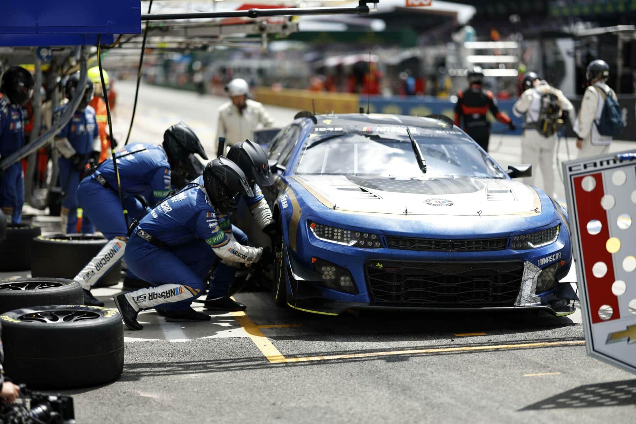 LE MANS, FRANCE – JUNE 06: The pit crew for the NASCAR Next Gen Chevrolet ZL1 celebrate after winning the pit stop challenge prior to the 100th anniversary of the 24 Hours of Le Mans at the Circuit de la Sarthe June 5, 2023 in Le Mans, France. on June 06, 2023 in Le Mans, France. (Photo by Chris Graythen/Getty Images)