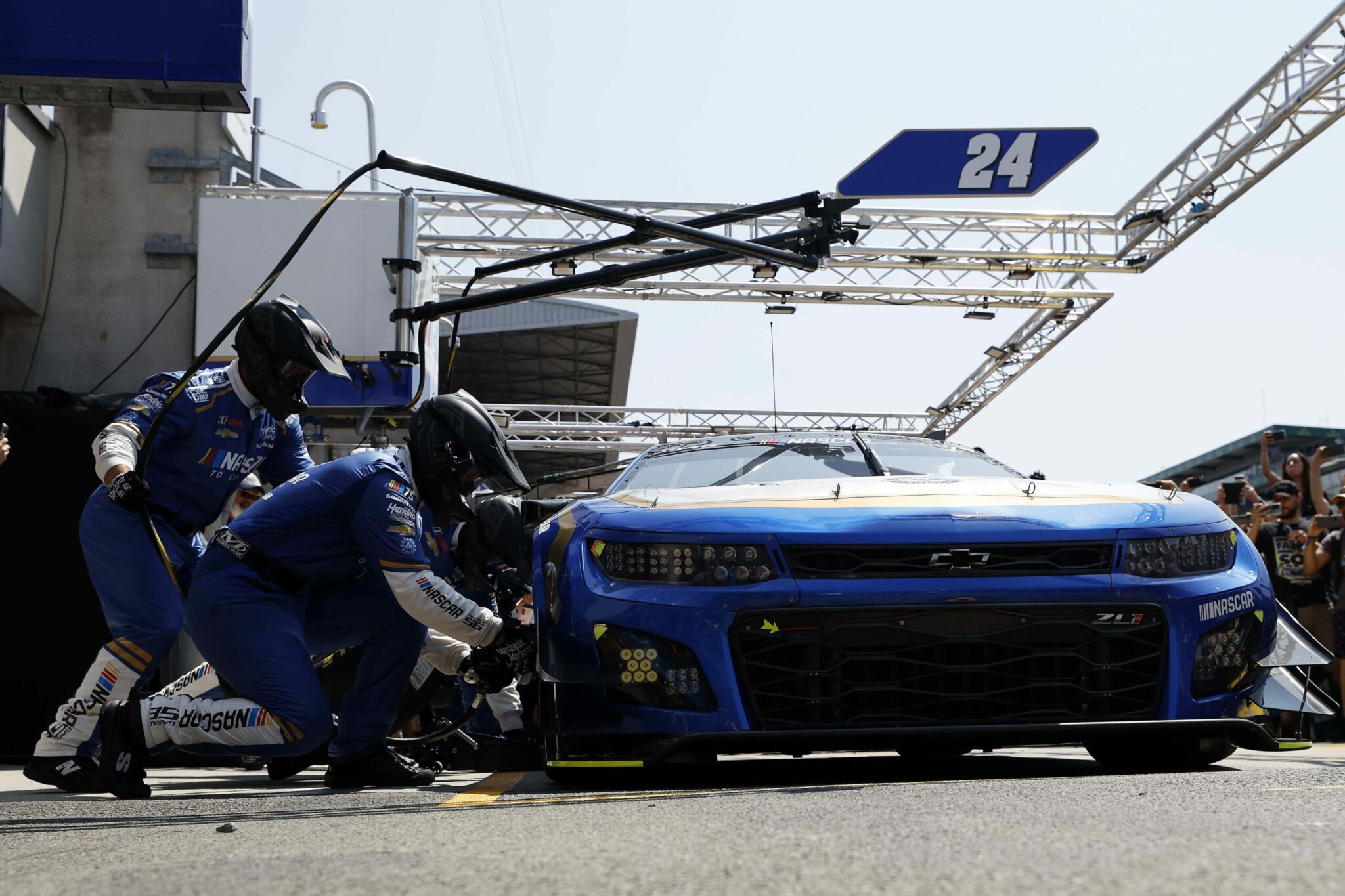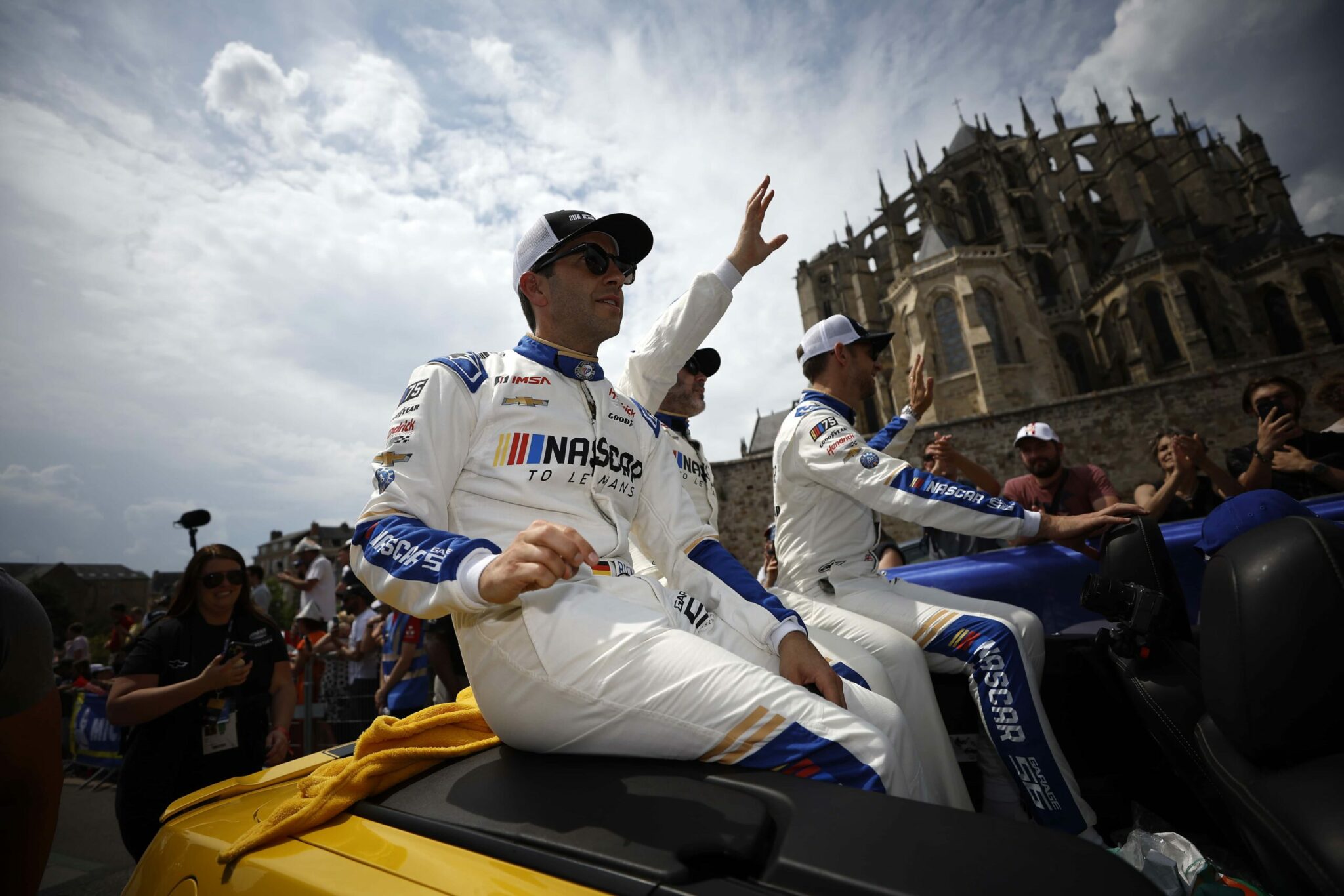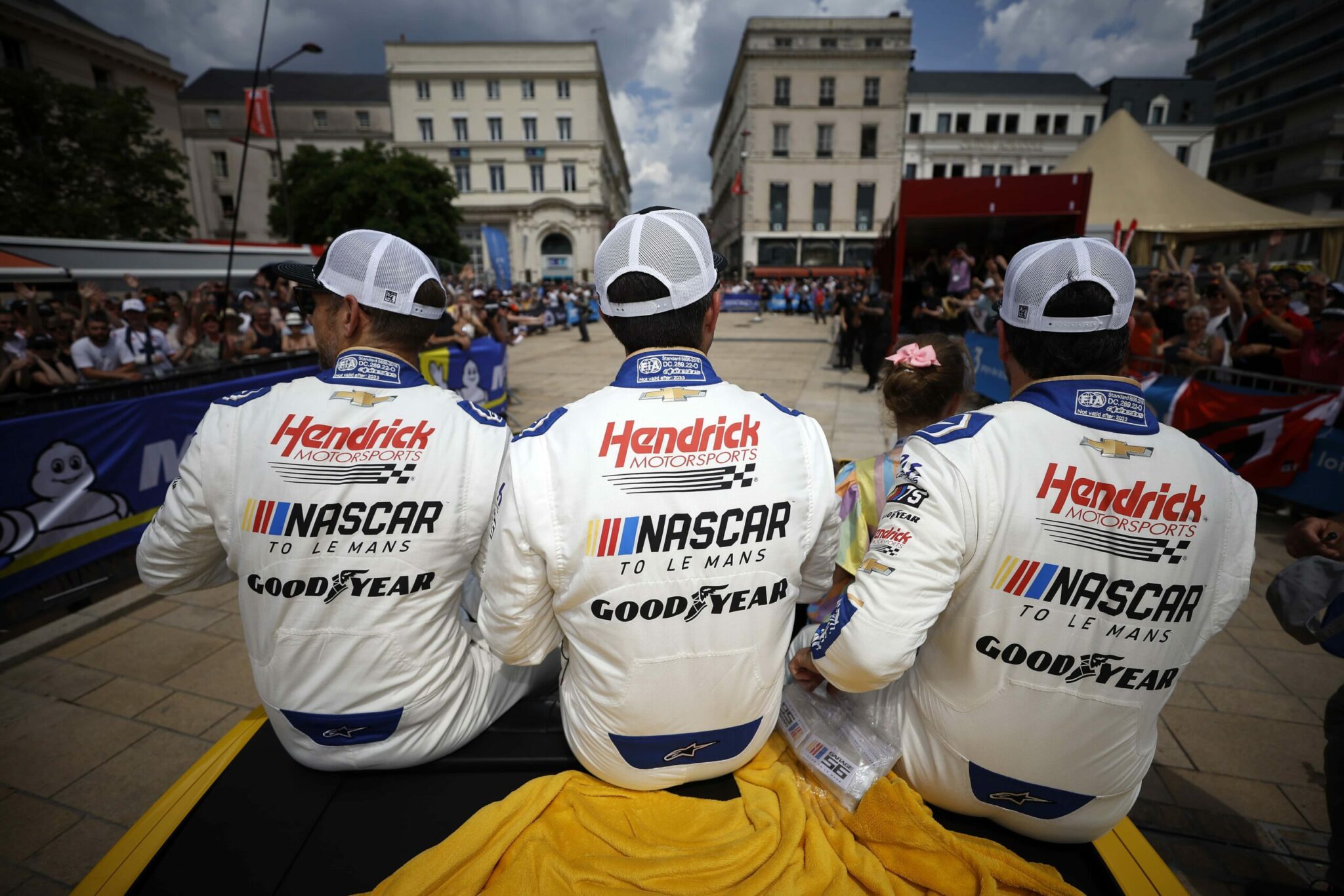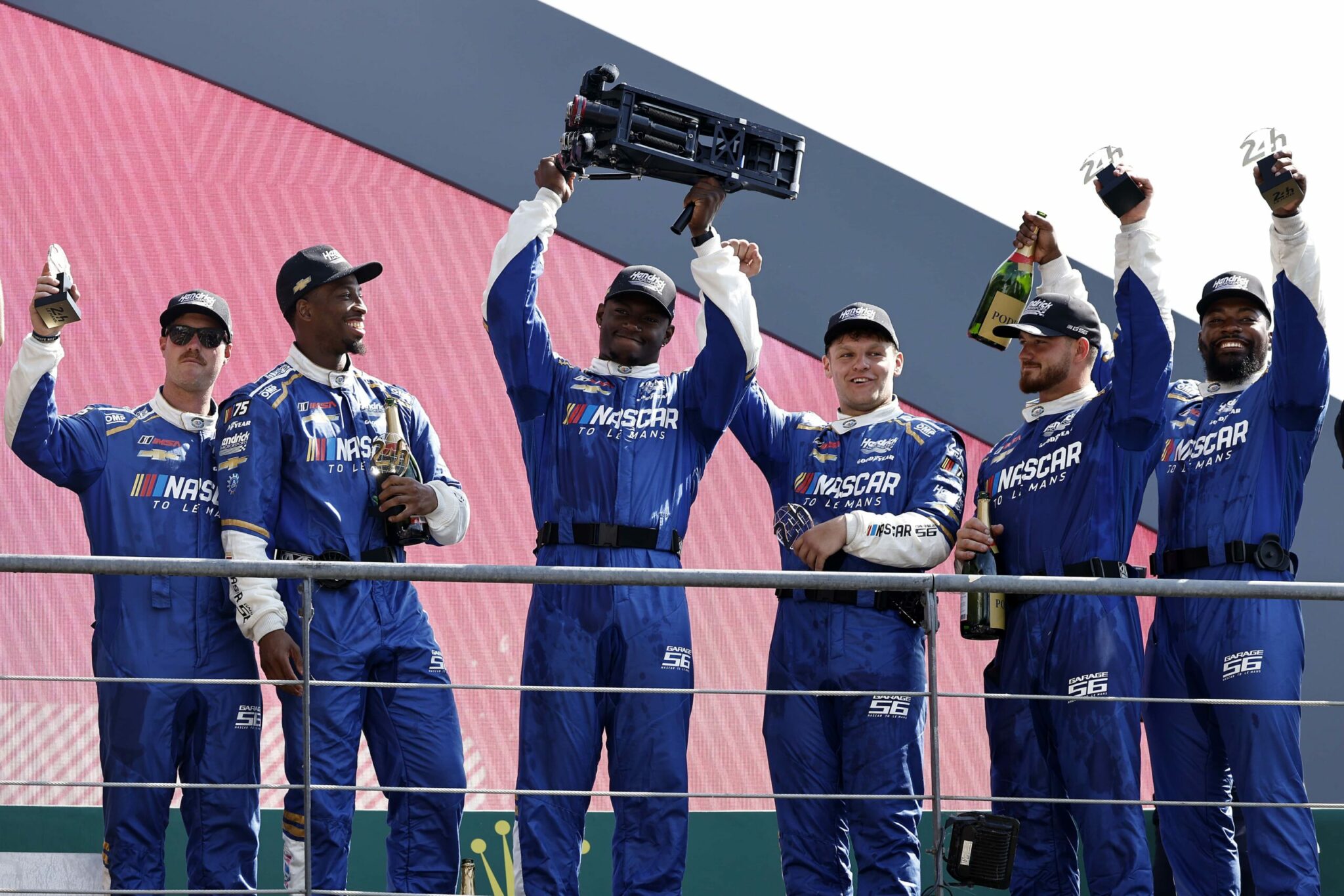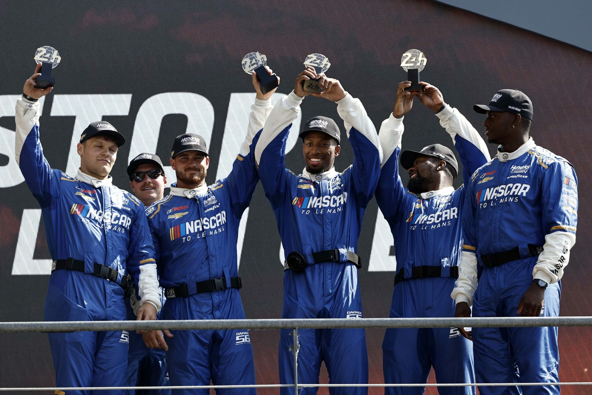 LE MANS, FRANCE – JUNE 06: The pit crew for the NASCAR Next Gen Chevrolet ZL1 celebrate after winning the pit stop challenge prior to the 100th anniversary of the 24 Hours of Le Mans at the Circuit de la Sarthe June 5, 2023 in Le Mans, France. on June 06, 2023 in Le Mans, France. (Photo by Chris Graythen/Getty Images)