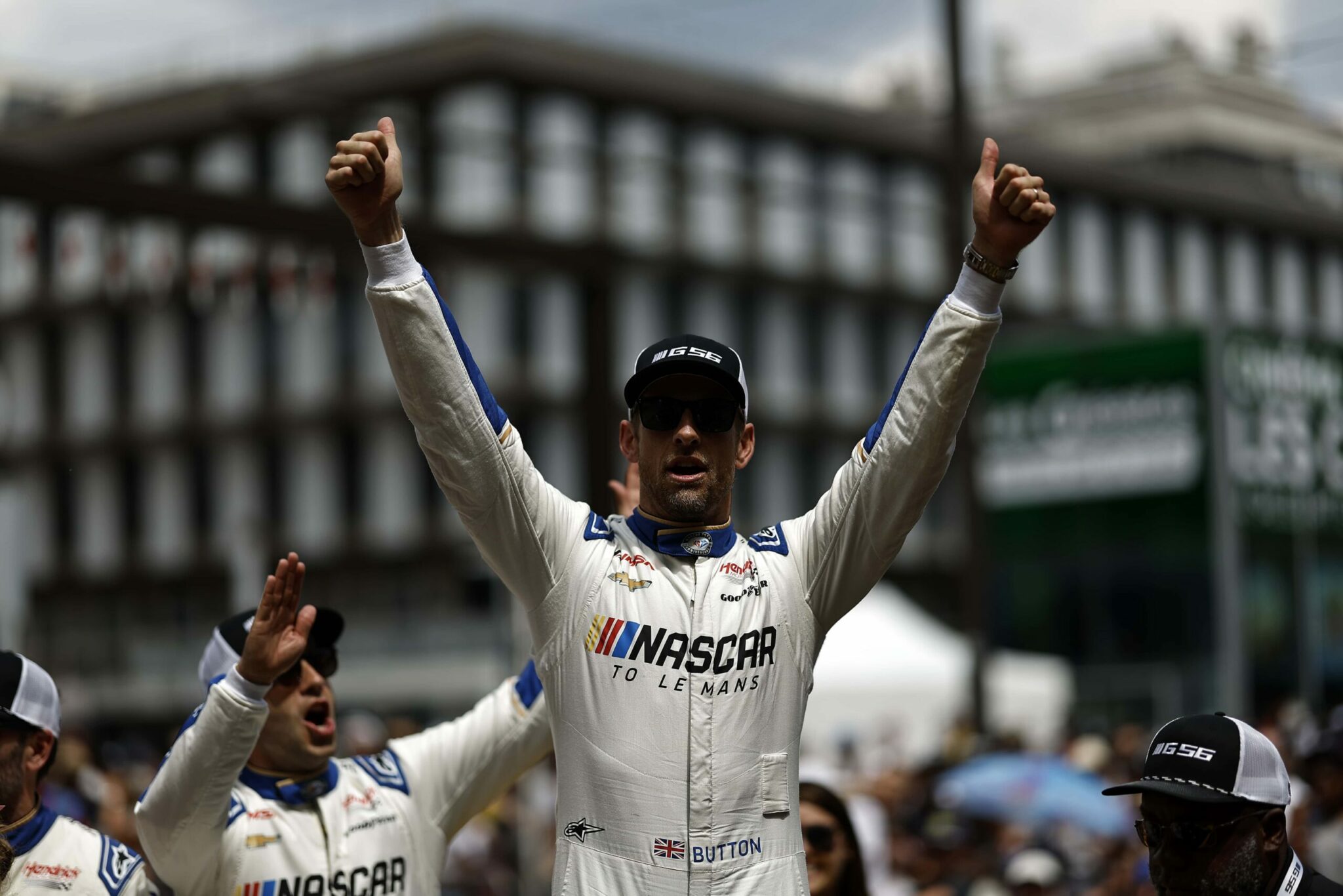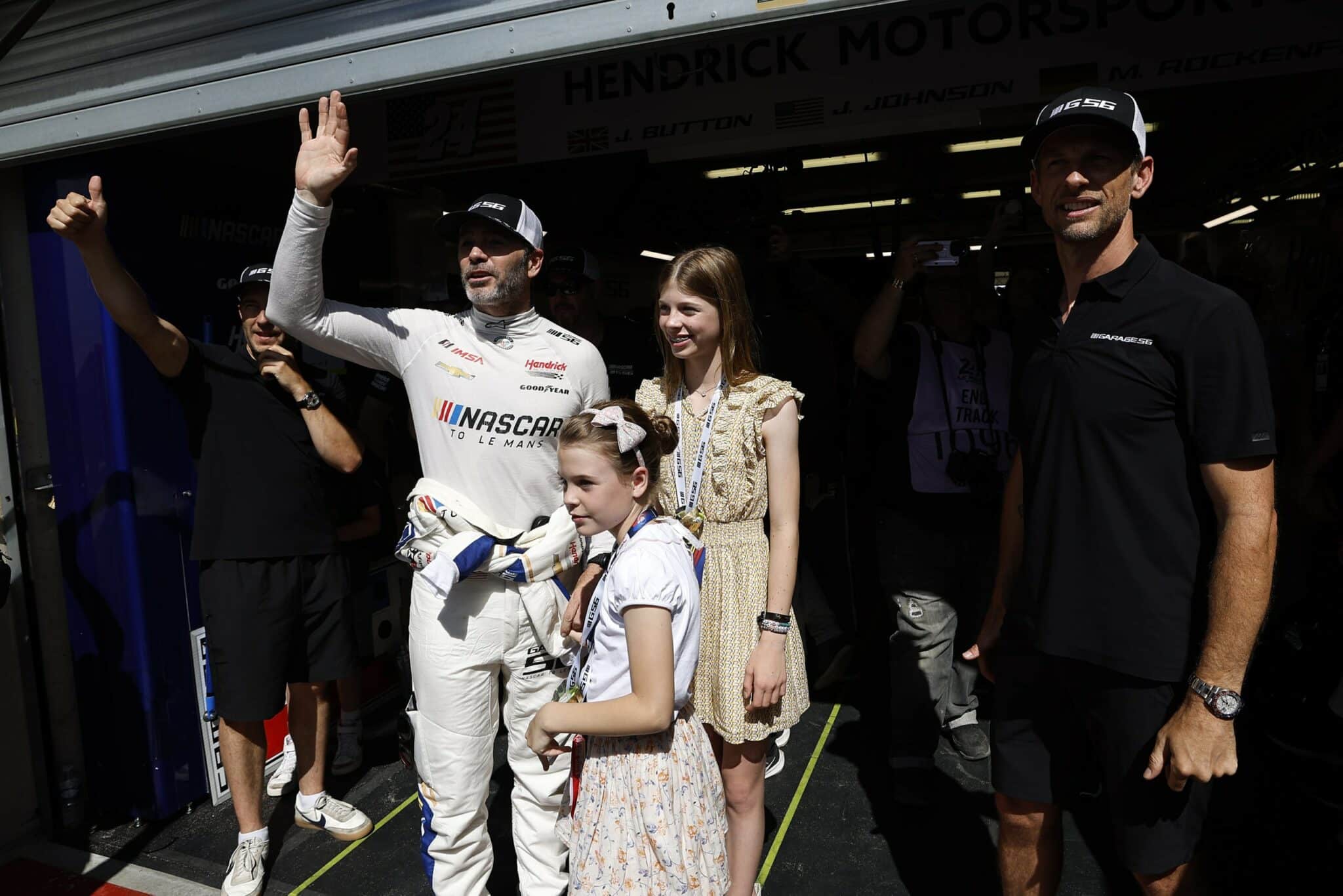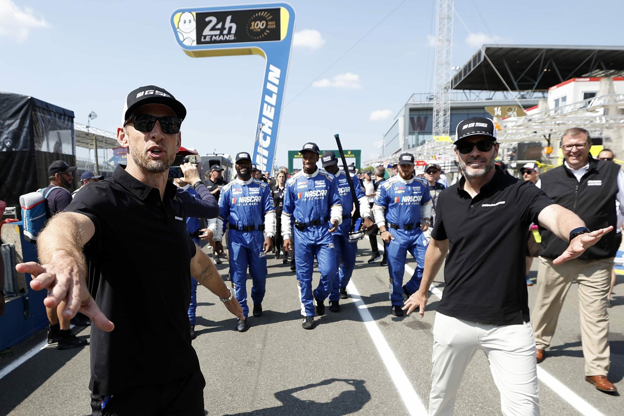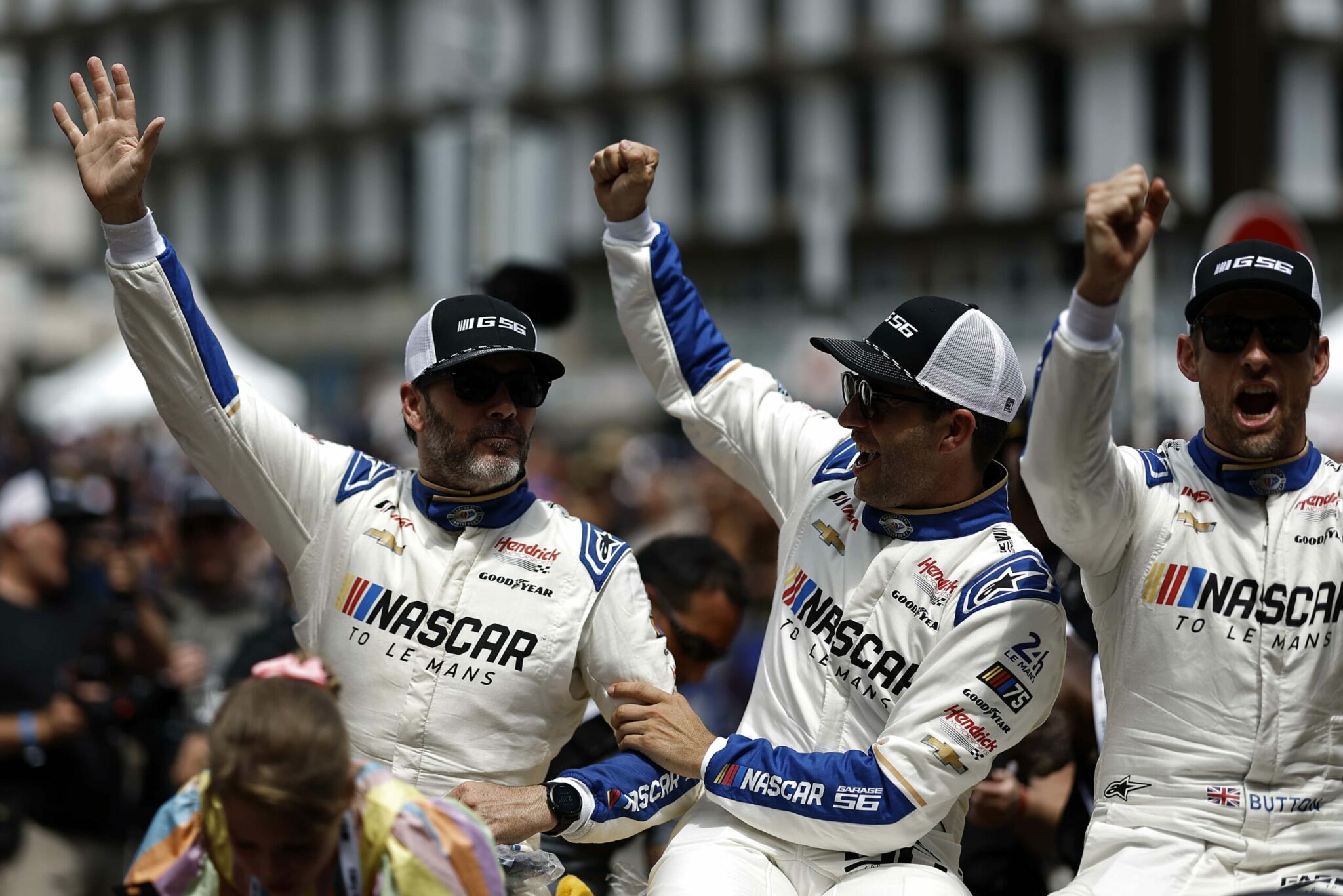 LE MANS, FRANCE – JUNE 06: Drivers Jenson Button and Jimmie Johnson of the #24 NASCAR Next Gen Chevrolet ZL1 act as security for their pit crew as they celebrate winning the pit stop challenge prior to the 100th anniversary of the 24 Hours of Le Mans at the Circuit de la Sarthe June 5, 2023 in Le Mans, France. on June 06, 2023 in Le Mans, France. (Photo by Chris Graythen/Getty Images)