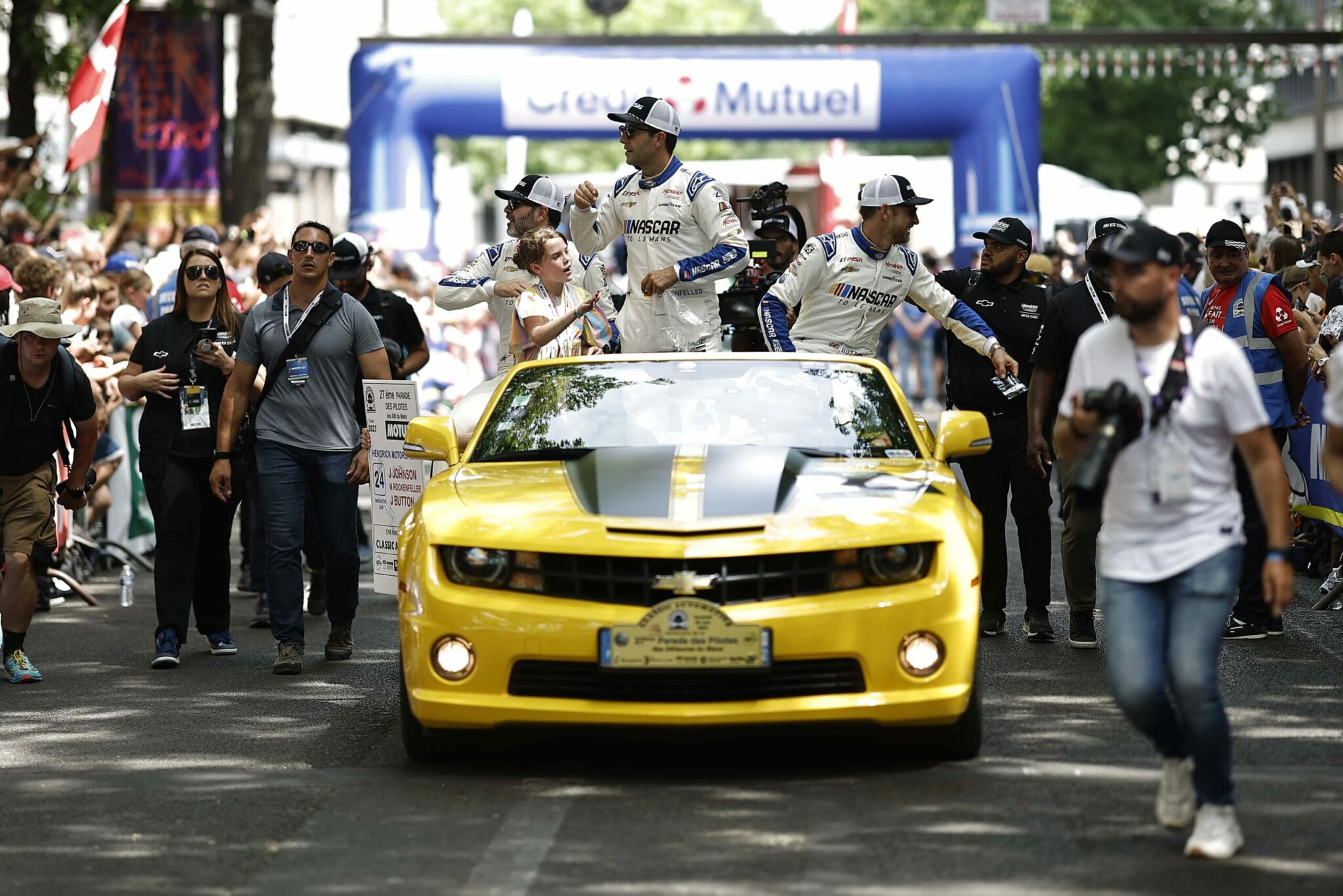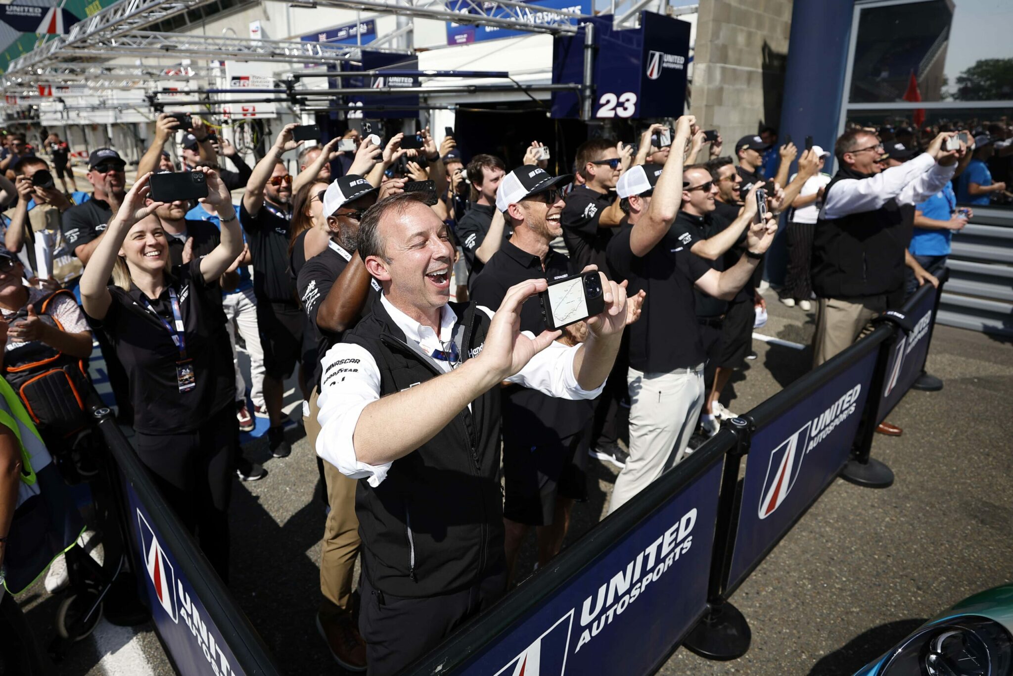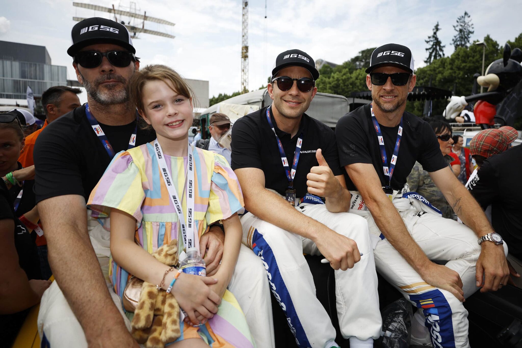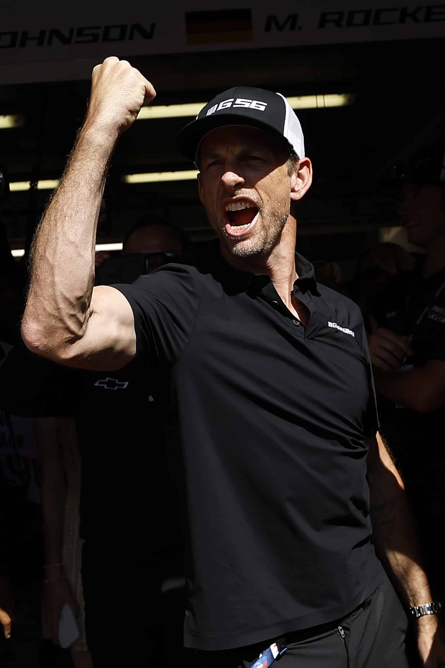 LE MANS, FRANCE – JUNE 06: Drivers Jenson Button and Jimmie Johnson of the #24 NASCAR Next Gen Chevrolet ZL1 act as security for their pit crew as they celebrate winning the pit stop challenge prior to the 100th anniversary of the 24 Hours of Le Mans at the Circuit de la Sarthe June 5, 2023 in Le Mans, France. on June 06, 2023 in Le Mans, France. (Photo by Chris Graythen/Getty Images)