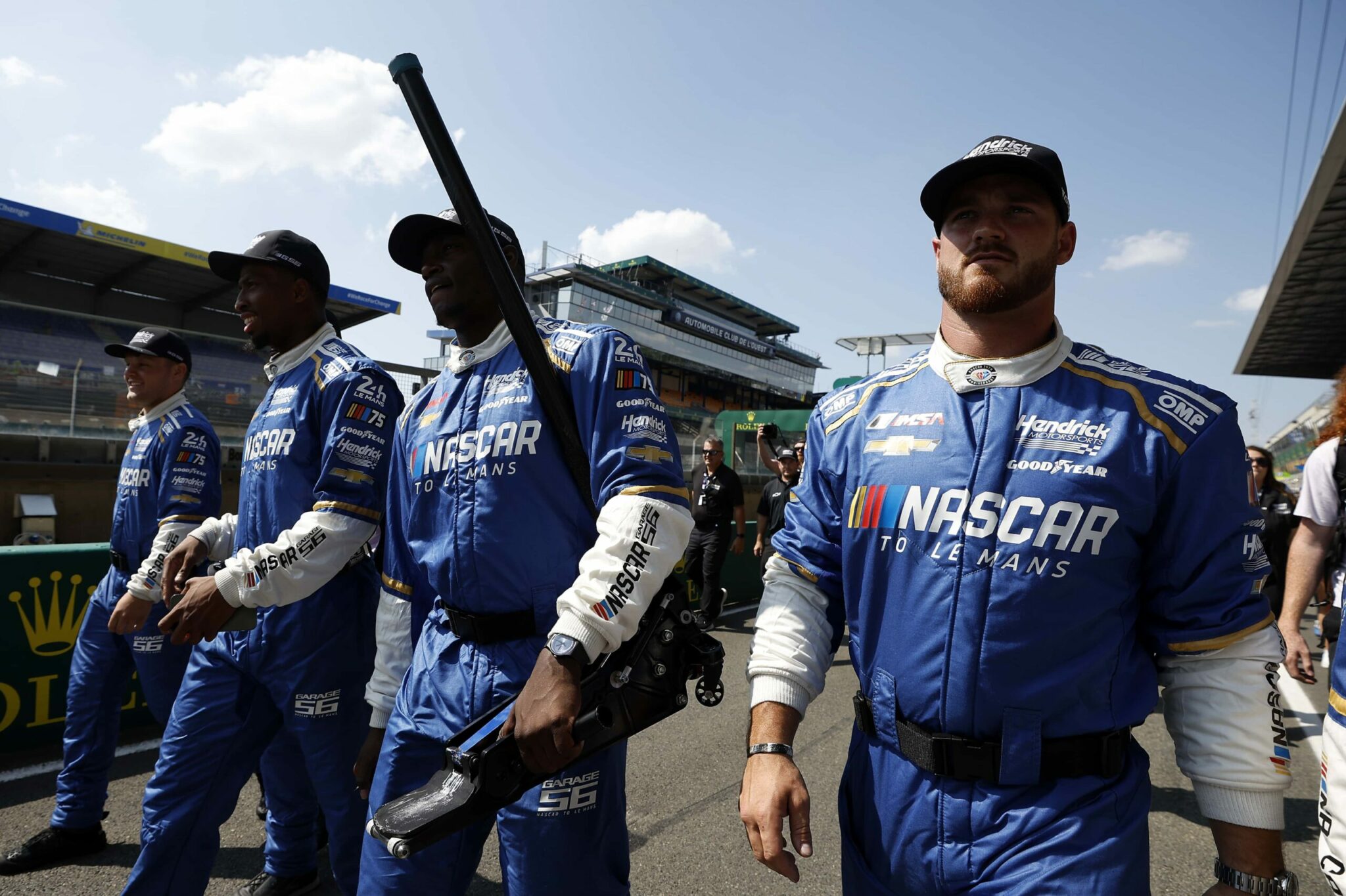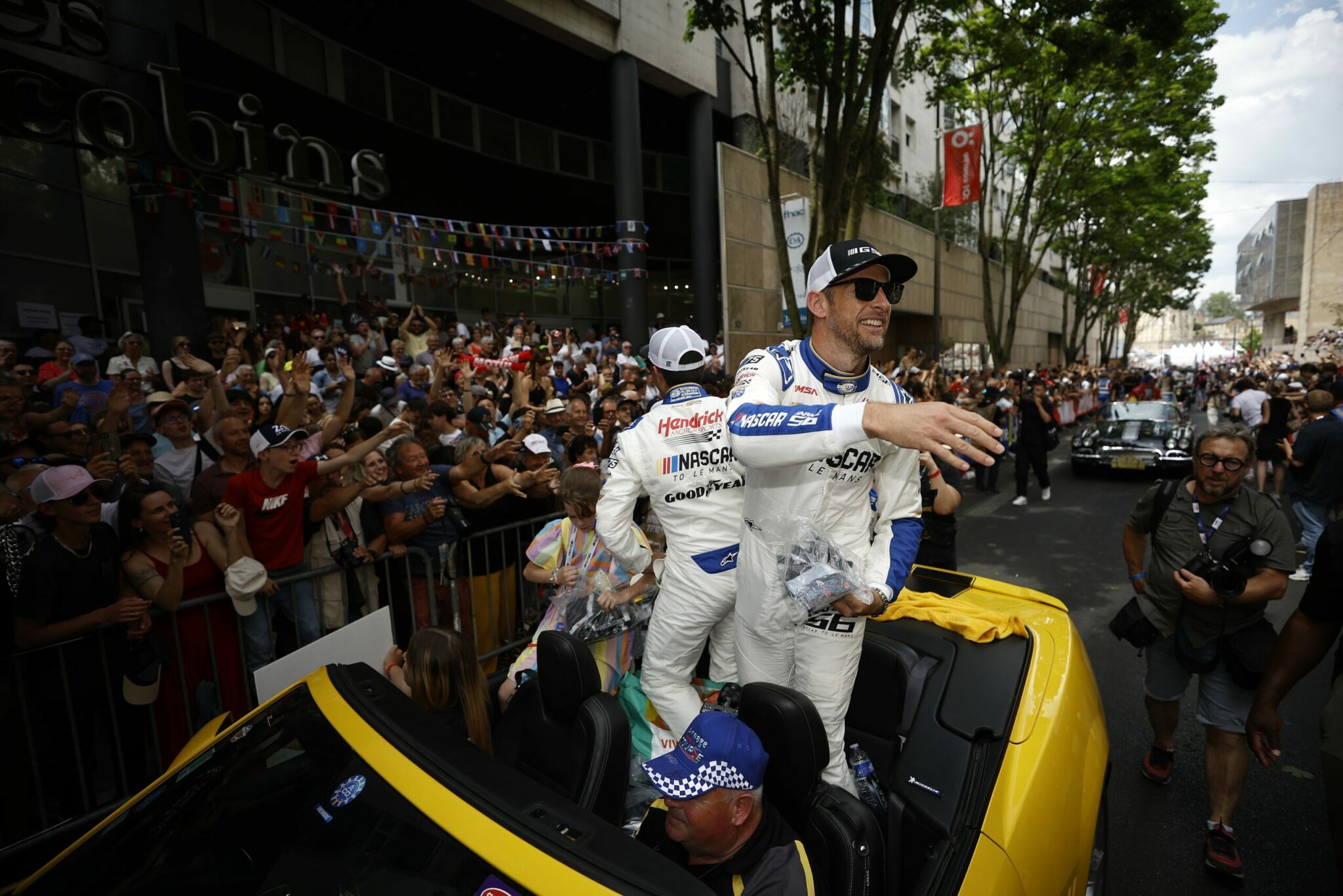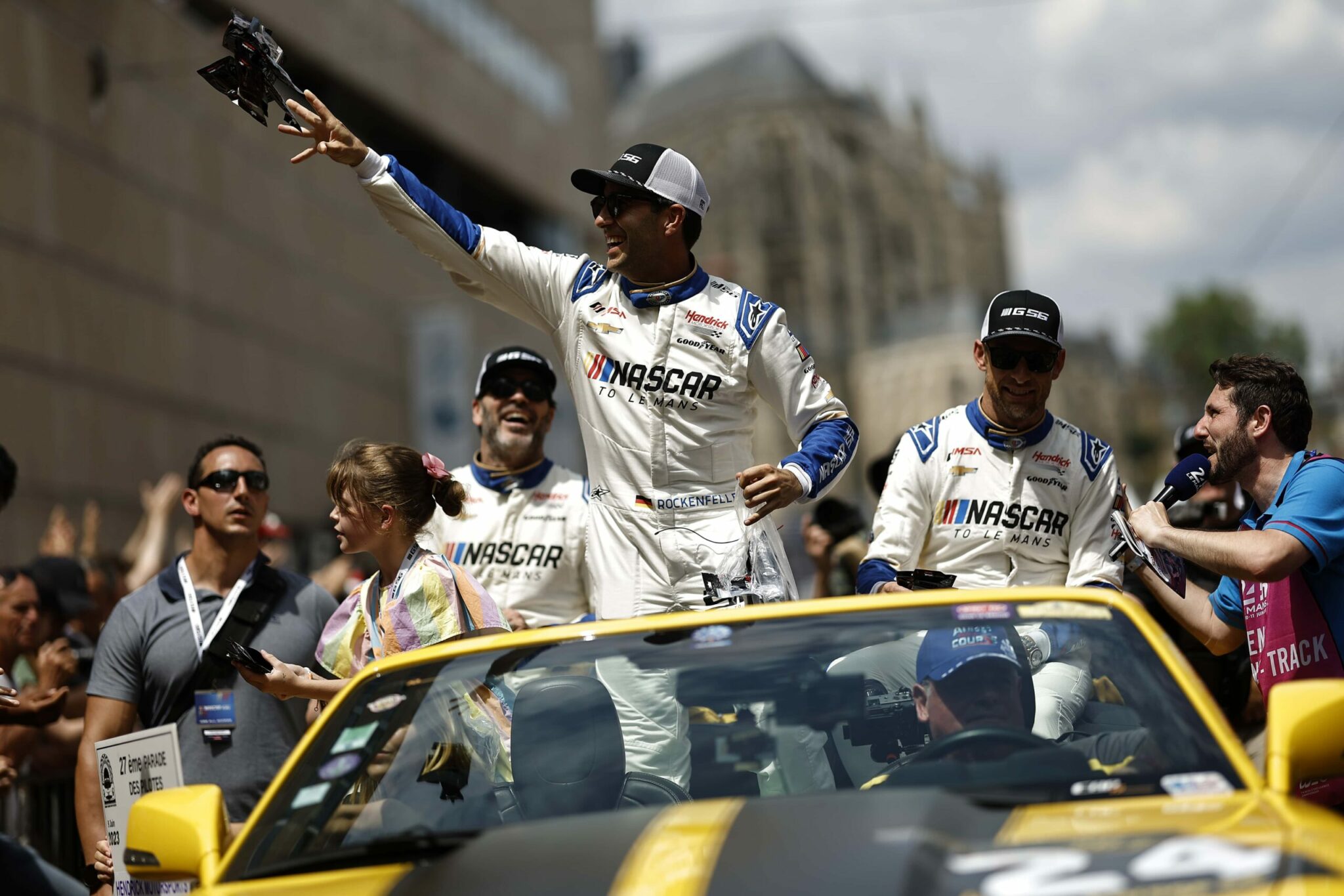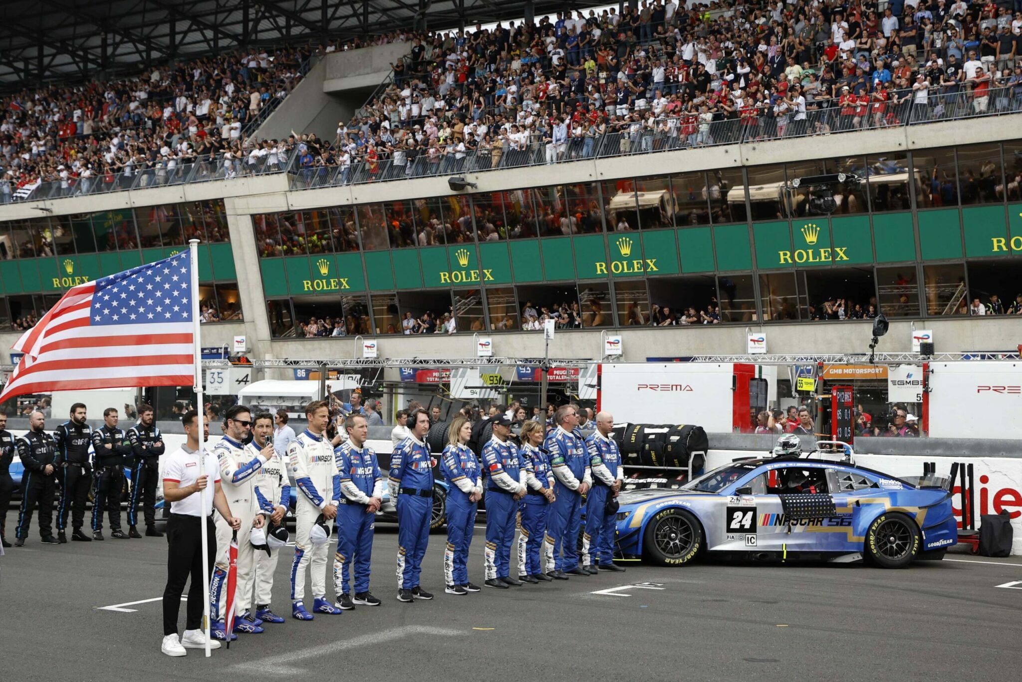 LE MANS, FRANCE – JUNE 06: Drivers Jenson Button and Jimmie Johnson of the #24 NASCAR Next Gen Chevrolet ZL1 act as security for their pit crew as they celebrate winning the pit stop challenge prior to the 100th anniversary of the 24 Hours of Le Mans at the Circuit de la Sarthe June 5, 2023 in Le Mans, France. on June 06, 2023 in Le Mans, France. (Photo by Chris Graythen/Getty Images)