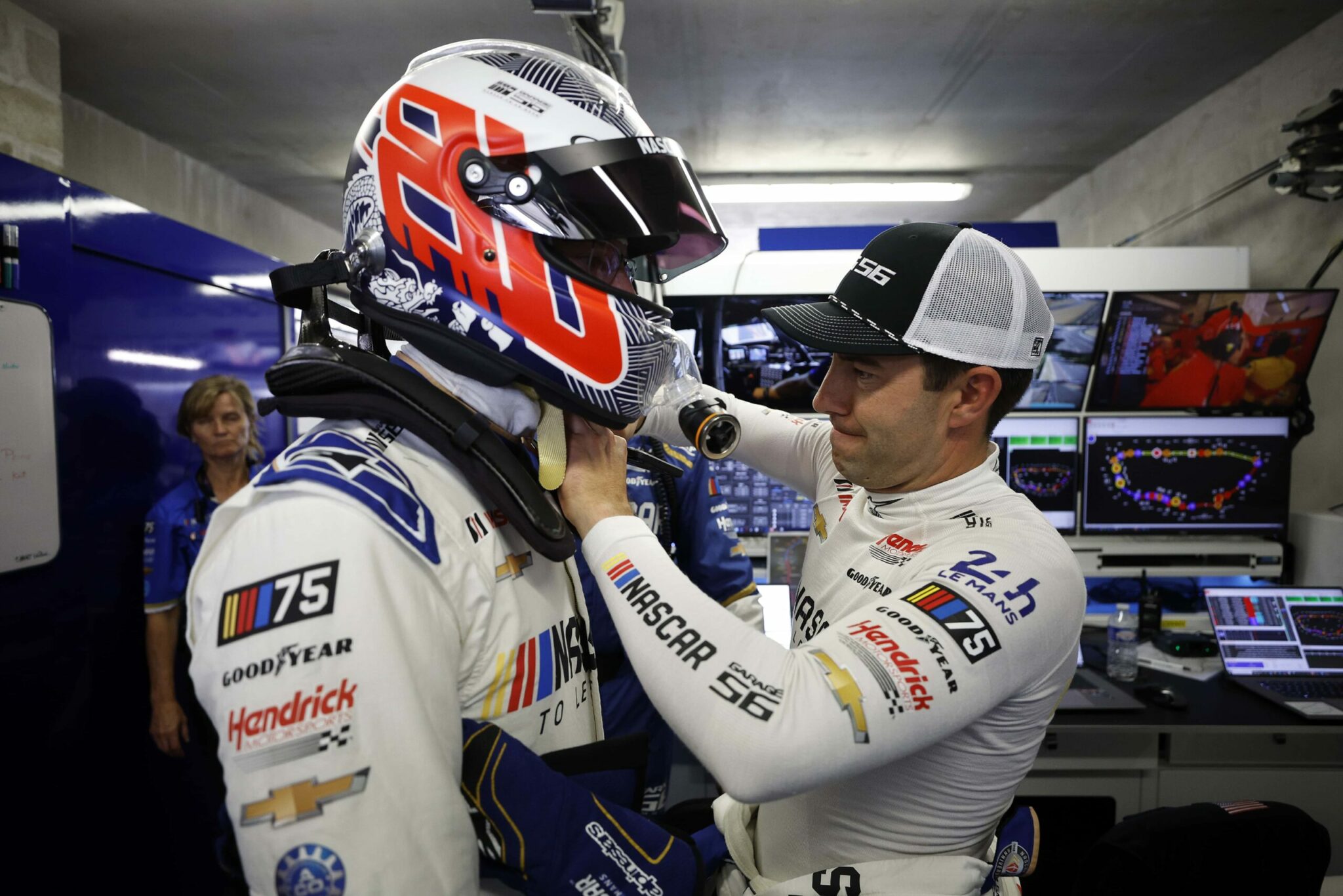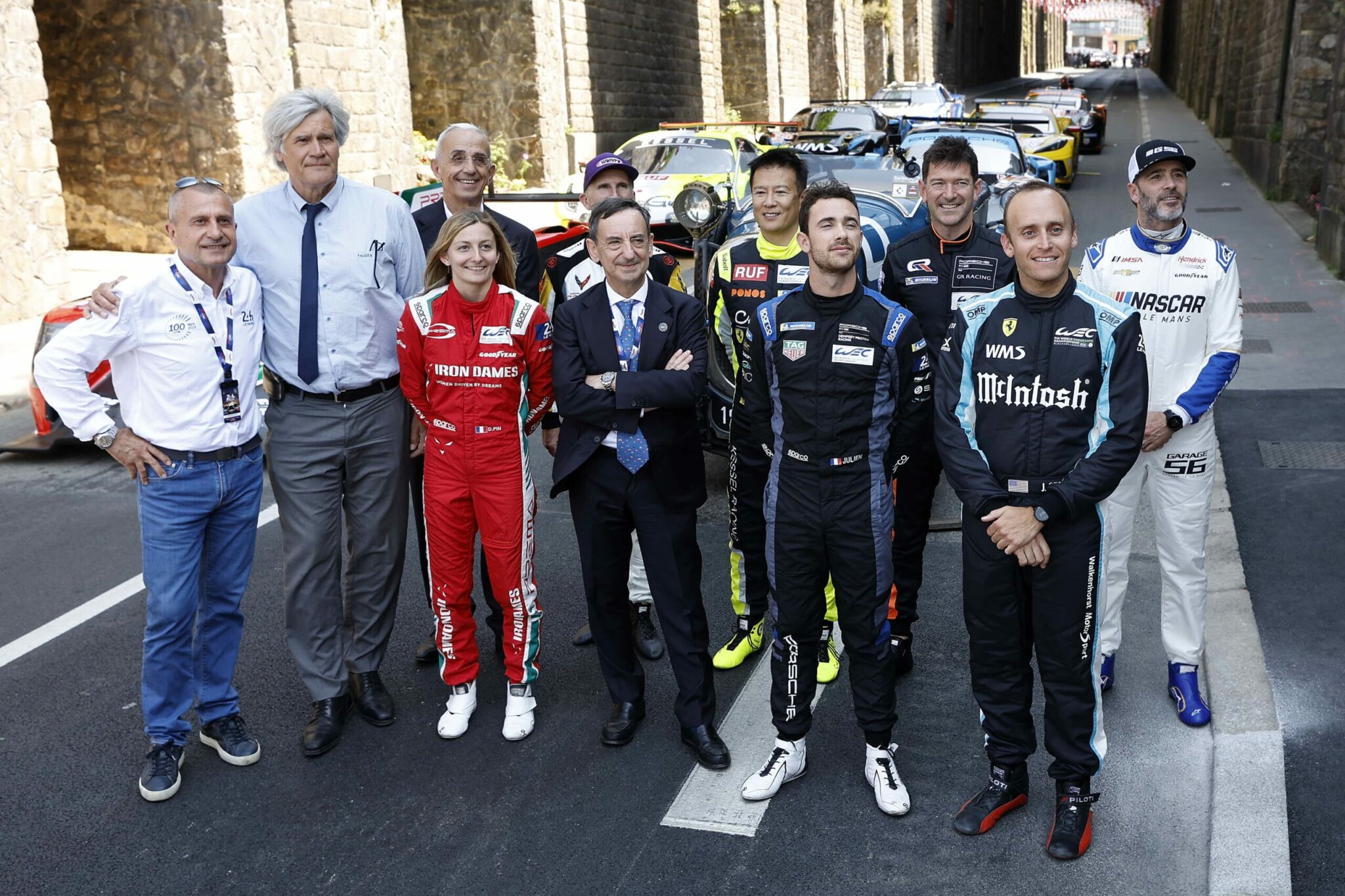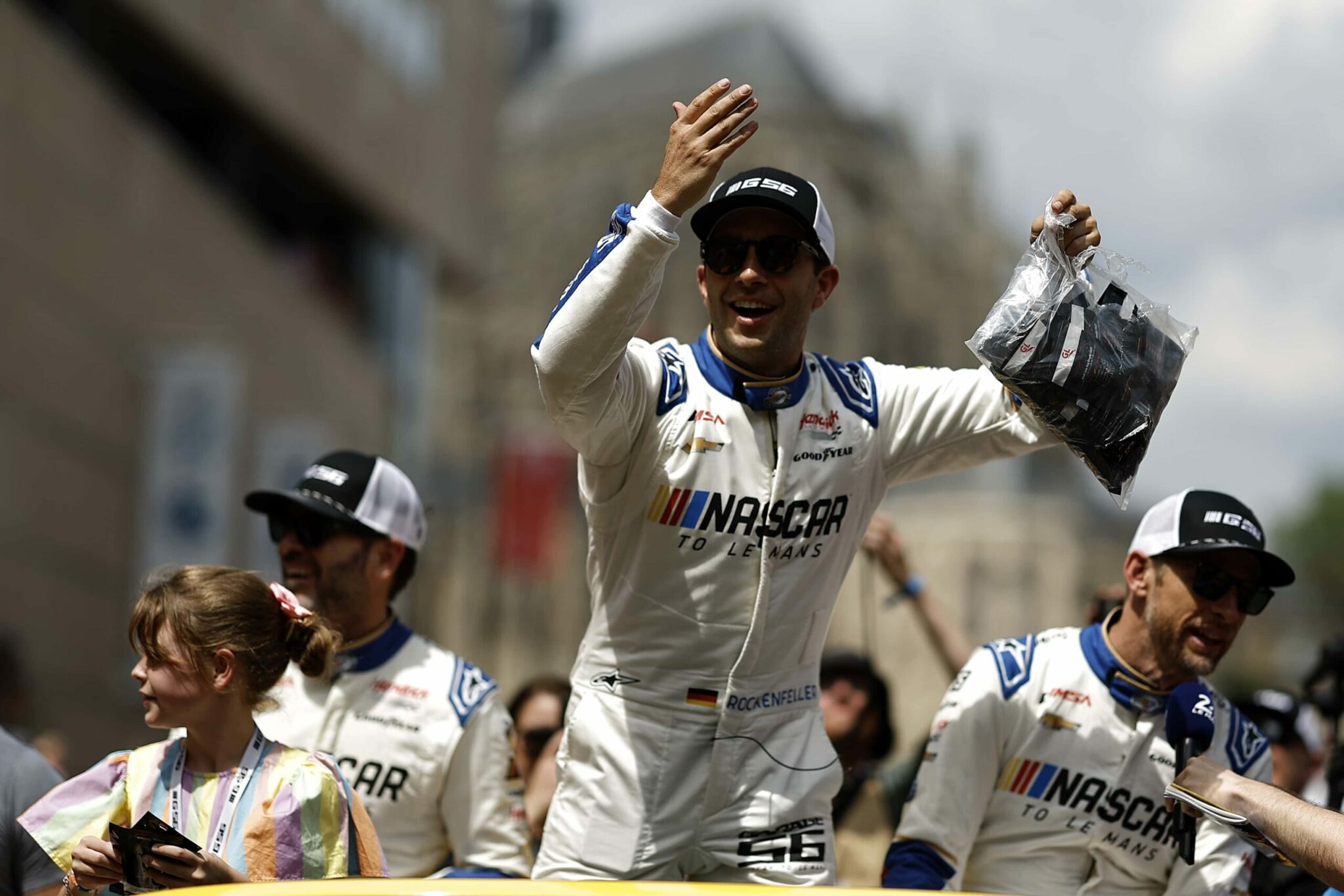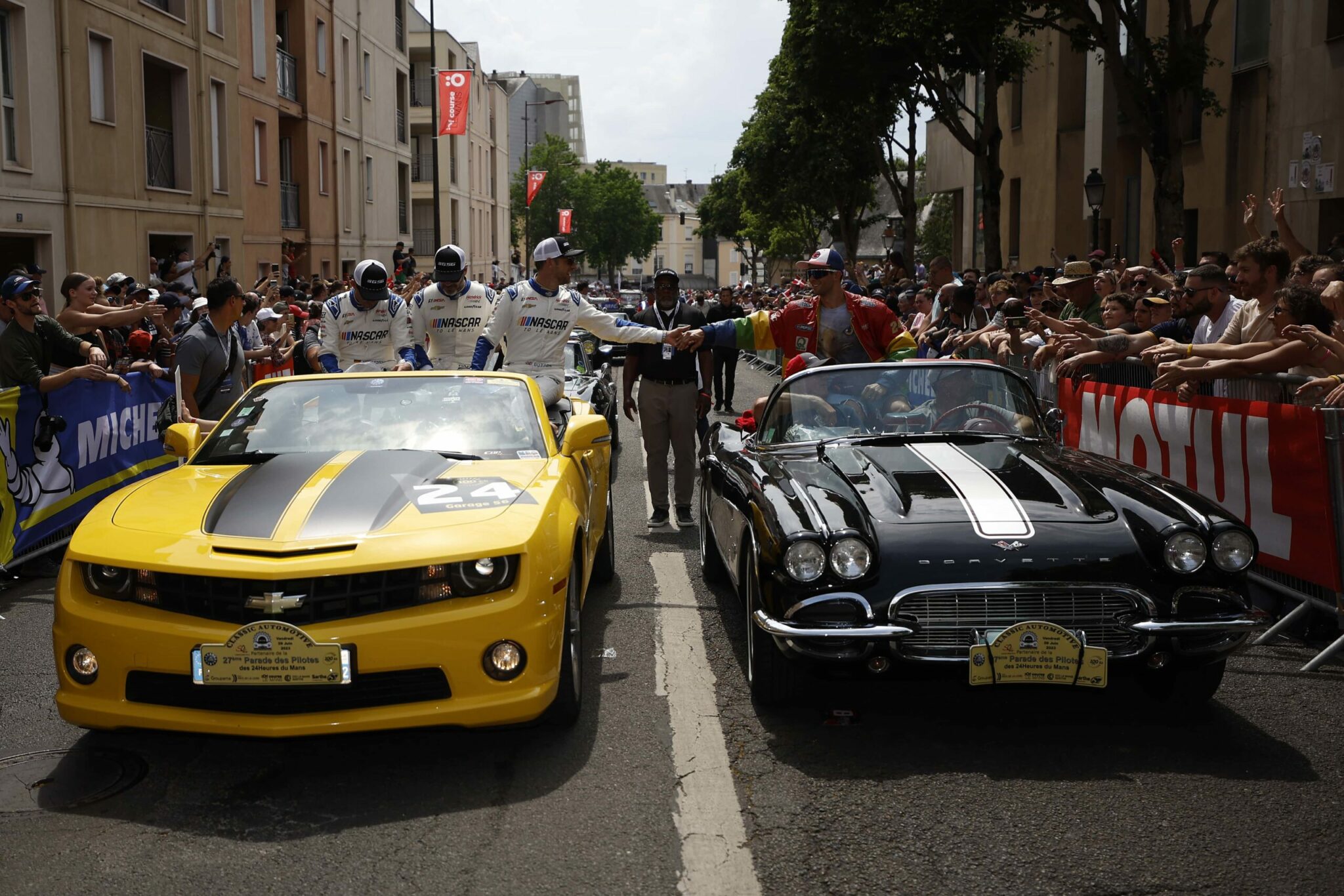 LE MANS, FRANCE – JUNE 06: Drivers Jenson Button and Jimmie Johnson of the #24 NASCAR Next Gen Chevrolet ZL1 act as security for their pit crew as they celebrate winning the pit stop challenge prior to the 100th anniversary of the 24 Hours of Le Mans at the Circuit de la Sarthe June 5, 2023 in Le Mans, France. on June 06, 2023 in Le Mans, France. (Photo by Chris Graythen/Getty Images)