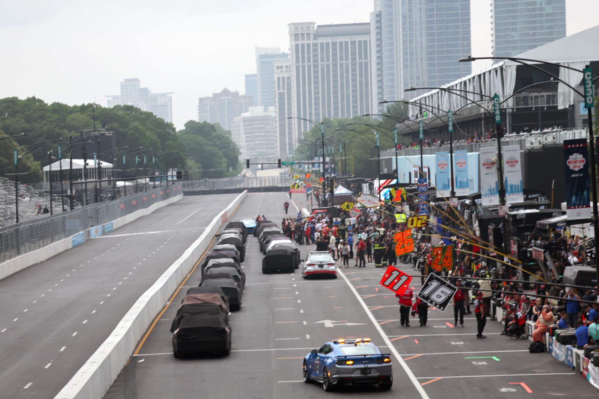 25 tours et puis s’en va, la course de la deuxième division de la NASCAR dans les rues de Chicago n’a pu aller à son terme. En effet, du fait d’éclairs dans un rayon de 8 miles par rapport au tracé, les officiels n’ont eu d’autre choix que d’interrompre la course au drapeau rouge.