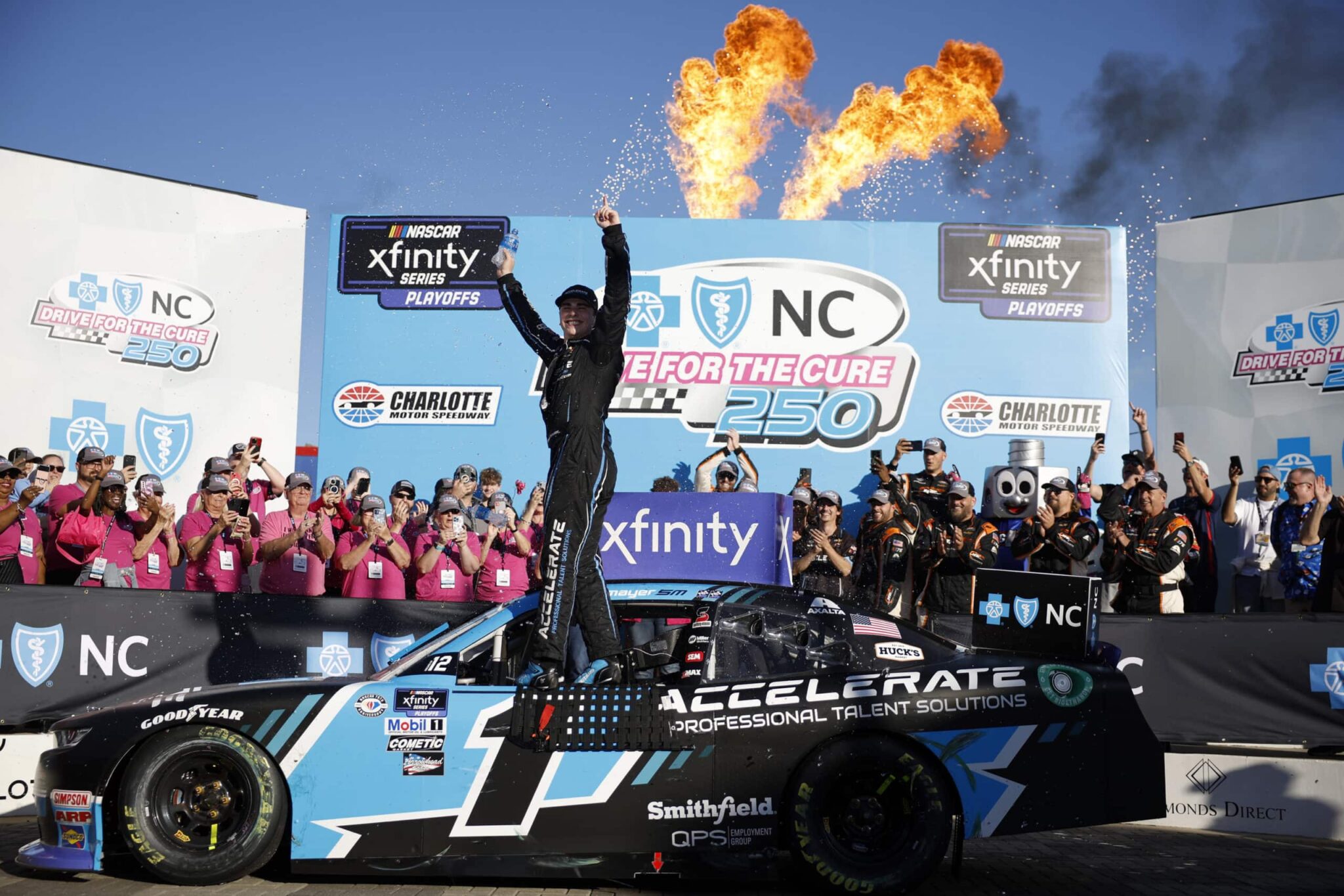 Contraint à la victoire pour obtenir sa qualification au Round of 8 Sam Mayer a décroché la victoire en NASCAR XFINITY Series à Charlotte sur le circuit routier de Charlotte.