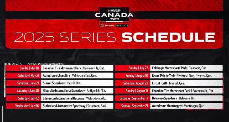 « Le calendrier 2025 met en valeur la diversité et la qualité du sport automobile canadien, a déclaré Alan Labrosse, directeur général de la série NASCAR Canada. Avec une combinaison solide de circuits classiques et de nouvelles pistes palpitantes, ce calendrier représente le meilleur de ce que NASCAR Canada a à offrir, tout en garantissant que nos équipes et nos concurrents puissent prospérer. »