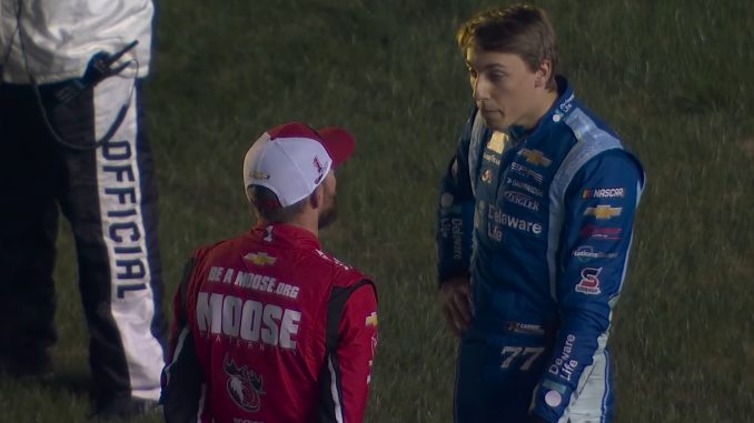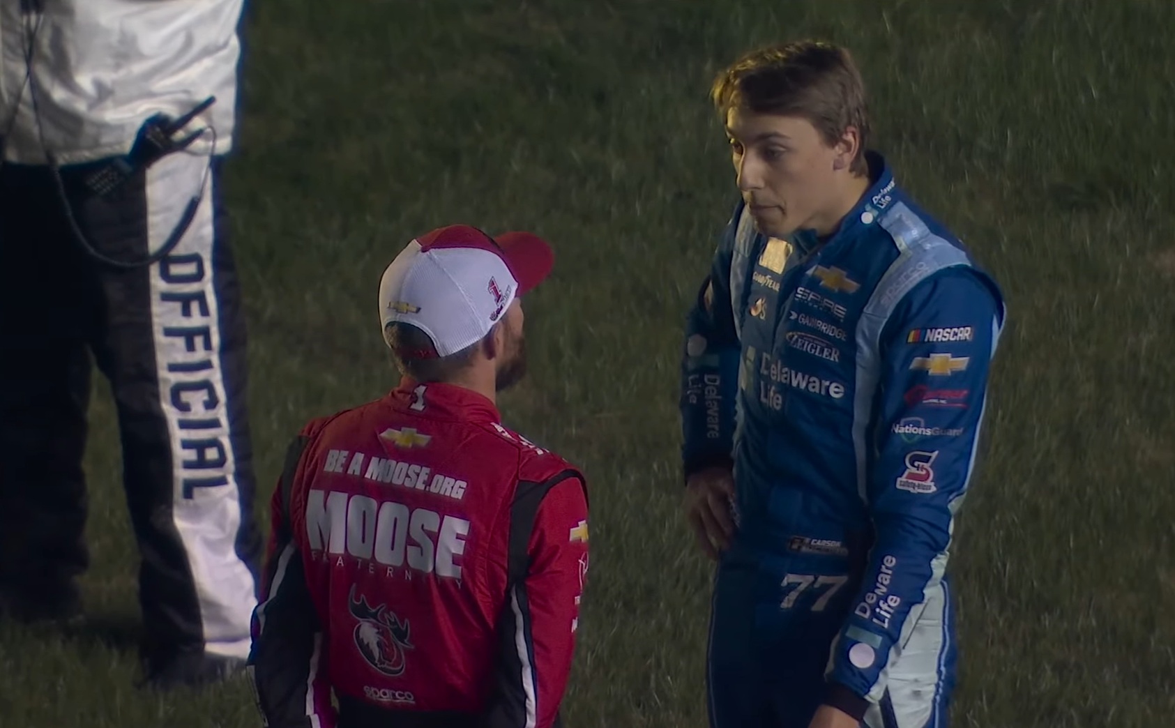 Ross Chastain a été le premier à demander des explications à Hocevar après l’arrivée. Les deux pilotes ont fini par s’éloigner de la foule sur la pit lane pour discuter sur l’herbe. Chastain a refusé de dévoiler le contenu de leur conversation à la radio, et Hocevar est resté tout aussi évasif.