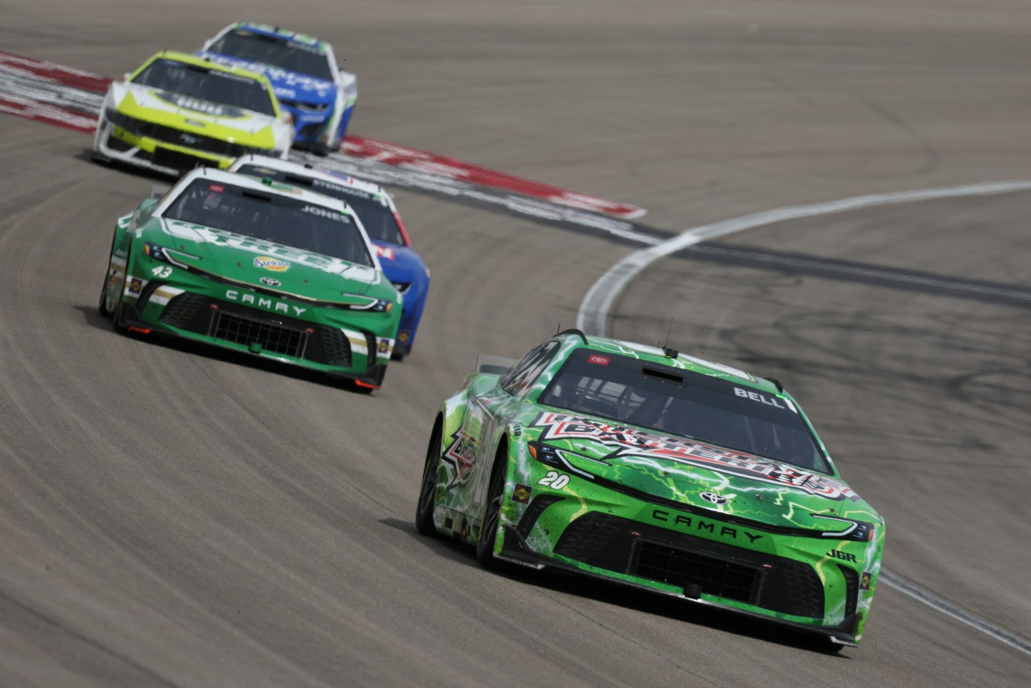 Sur le Las Vegas Motor Speedway, Christopher Bell part de son stand avec sa roue arrière gauche mal serrée. Plutôt que de perdre la roue en piste et d’écoper de deux tours de pénalité, en plus d’un possible endommagement de la voiture, Adam Stevens, le chef d’équipe de Christopher Bell, prend la décision de faire arrêter son pilote chez Chase Briscoe, coéquipier au sein de la Joe Gibbs Racing. Le règlement est clair dans ce cas, il s’agit d’un arrêt en dehors de son emplacement, une infraction sanctionnée sous drapeau jaune, par une relégation à l’arrière du peloton.
