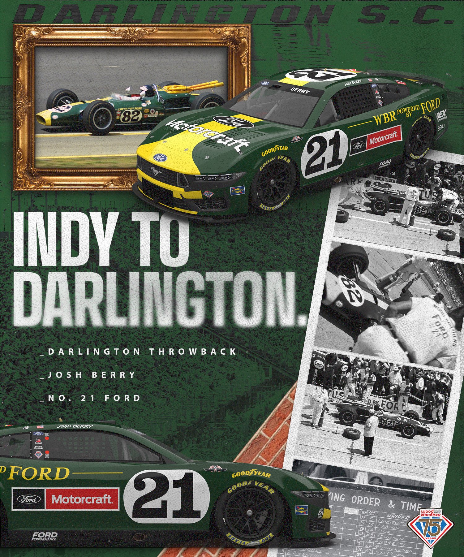 Lors des Goodyear 400, Josh Berry au volant de la Ford Mustang n°21 de la Wood Brothers roulera avec la déco de Jim Clark lors de son sacre à l’Indy 500 1965.