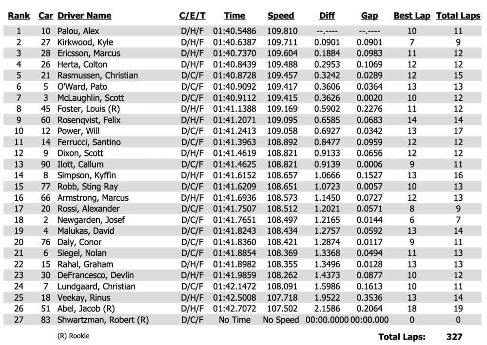 Au volant de la Honda n°10 du Chip Ganassi Racing, Palou a bouclé un tour en 1:40.5486. Kyle Kirkwood (Honda n°27 – Andretti Global) s’est classé deuxième à 0.0901s, suivi de Marcus Ericsson (Honda n°28 – Andretti Global) à 0.1884s. Colton Herta (Honda n°26 – Andretti Global) complète le quatuor de tête à 0.2953s.