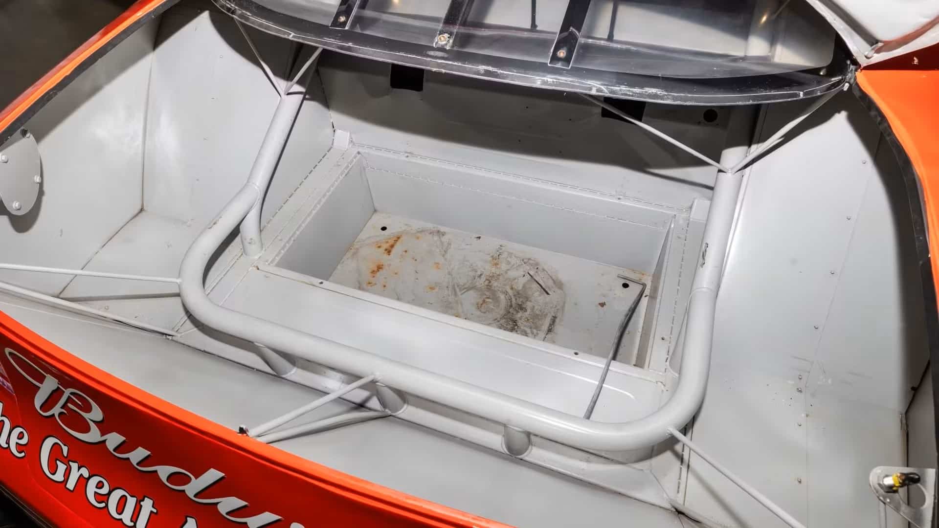 Sous sa robe rouge, cette Dodge était à l’époque animée par un V8 de 358 ci développant plus de 700 chevaux, accouplé à une boîte manuelle à 4 rapports. Aujourd’hui, elle est vide, mais conserve son arceau de sécurité, un siège baquet Richardson, un harnais Simpson et un compartiment arrière pouvant accueillir une cellule de carburant. Si sa remise en route nécessitera un travail conséquent, la base est saine et le châssis bien préparé. Pour un amateur éclairé, il s’agit d’un projet bien plus réaliste qu’une stock-car construit de zéro.