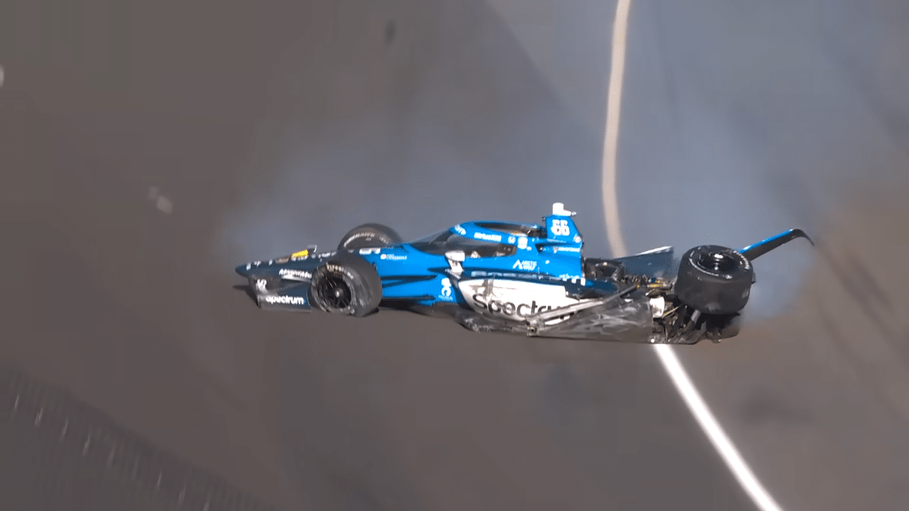 Alors qu’il abordait le virage à haute vitesse, la Honda n°66 du Meyer Shank Racing est entrée légèrement trop haut dans la trajectoire. La monoplace a décroché de l’arrière, est partie en tête-à-queue, et a violemment tapé le mur extérieur avec l’arrière-gauche avant de rebondir et de subir un deuxième impact majeur sur le flanc gauche.