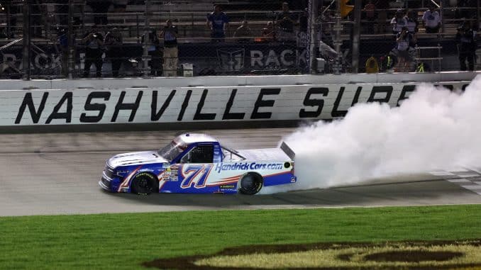 Victorieux du deuxième segment de la course, son neuvième cette saison, Corey Heim s’est arrêté lors de la neutralisation ce qui a permis à Rajah Caruth de prendre les commandes. Leader de 61 des 150 tours, dont les 51 derniers, Rajah Caruth s’est offert une guitare, le trophée remis à tout vainqueur sur le Nashville Superspeedway.