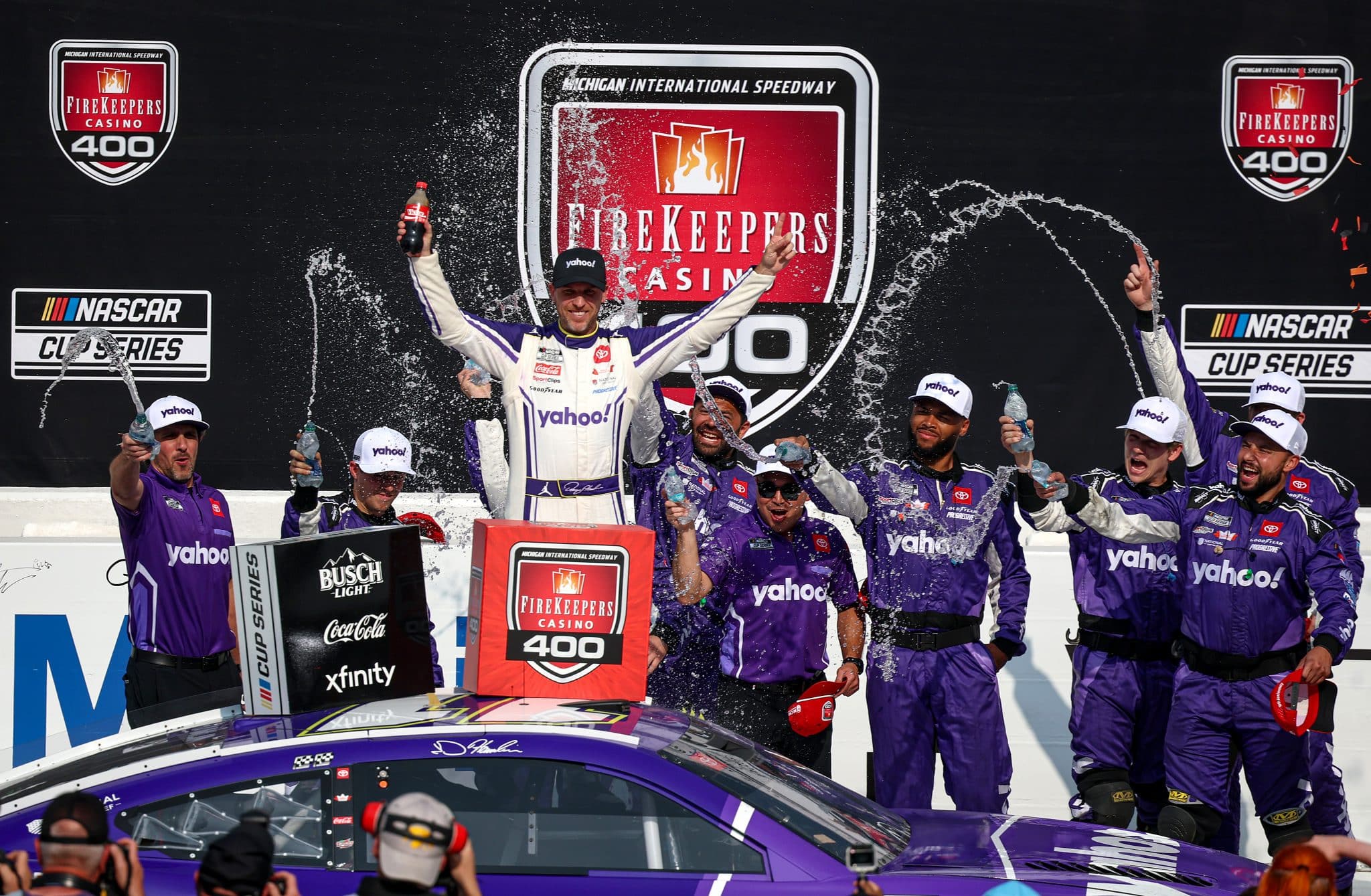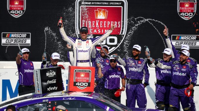 Denny Hamlin a été le maître de l’économie de carburant ce dimanche sur le Michigan International Speedway. Le pilote de la Joe Gibbs Racing avait juste ce qu’il fallait de carburant pour célébrer sa victoire avec un burnout dans la ligne droite avant de tomber en panne d’essence pour se rendre sur la Victory Lane.
