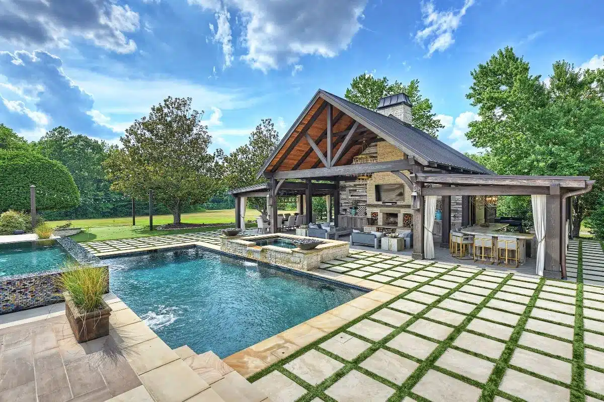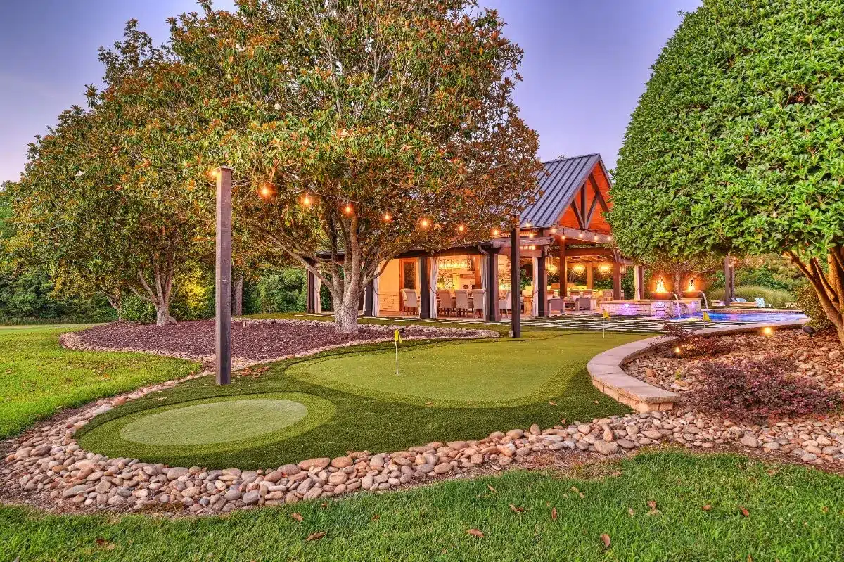 À l’extérieur, la propriété évoque l’ambiance d’un resort de luxe : piscine à débordement, pool-house, kitchenette extérieure avec cheminée, et même un putting green digne d’un country club.