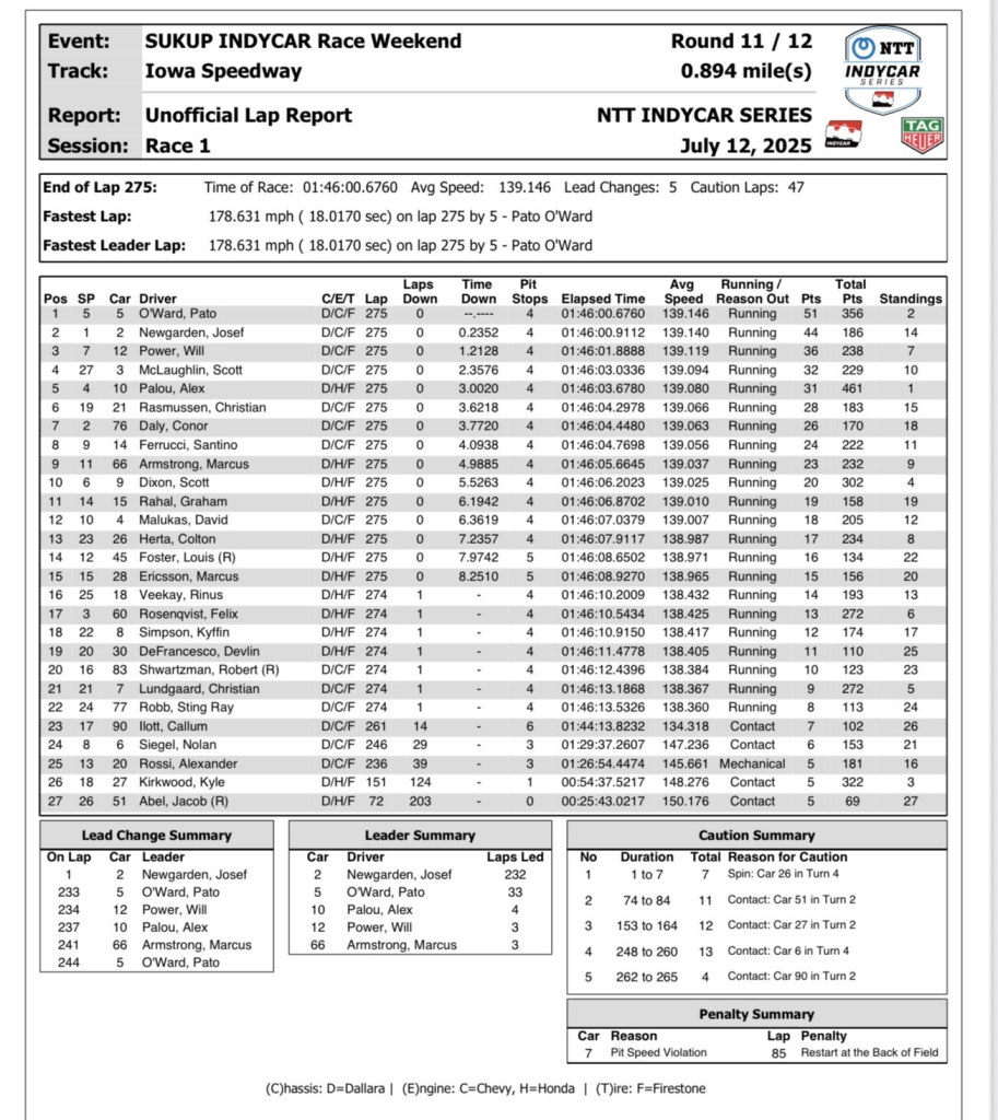 Le Mexicain profite aussi de cette victoire pour prendre la deuxième place du championnat, bénéficiant de l’abandon de Kyle Kirkwood qui est parti à la faute peu après la mi-course. Parmi les abandons, on retrouve également Jacob Abel, Nolan Siegel et Callum Ilott sur accident, ainsi qu’Alexander Rossi sur problème mécanique. Le crash de Siegel a d’ailleurs provoqué la sortie du drapeau rouge à moins de vingt tours du but, afin de mener à bien les réparations du mur du virage 4.
