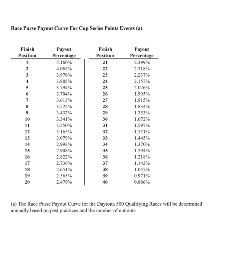 Ce mécanisme de rémunération, à la fois incitatif et compétitif, vise à renforcer la stabilité du plateau tout en récompensant la performance. Chaque fin de saison, la NASCAR communiquera les montants définitifs dus aux équipes dans les 30 jours suivant la dernière course du calendrier.