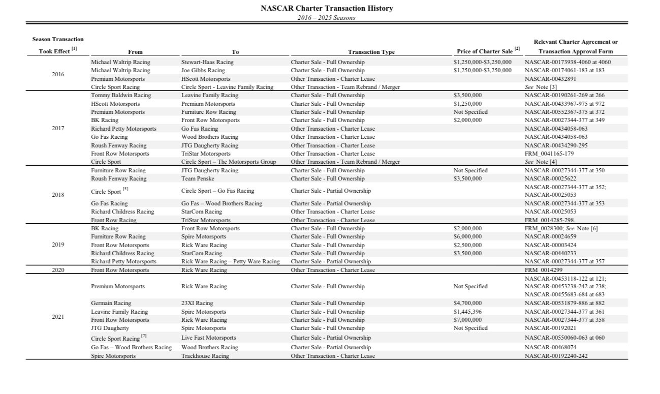 L’introduction des charters en 2016 a marqué une étape décisive. La NASCAR avait alors attribué 36 charters à des équipes engagées à temps plein sur les trois saisons précédentes. Le principe était simple : offrir une garantie de participation et une part des revenus plus stable pour permettre aux équipes de planifier sur le long terme. Pourtant, les premières transactions restaient modestes. La Michael Waltrip Racing déclarait avoir vendu ses deux charters entre 1 250 000 $ et 3 250 000 $, des montants aujourd’hui presque anecdotiques.