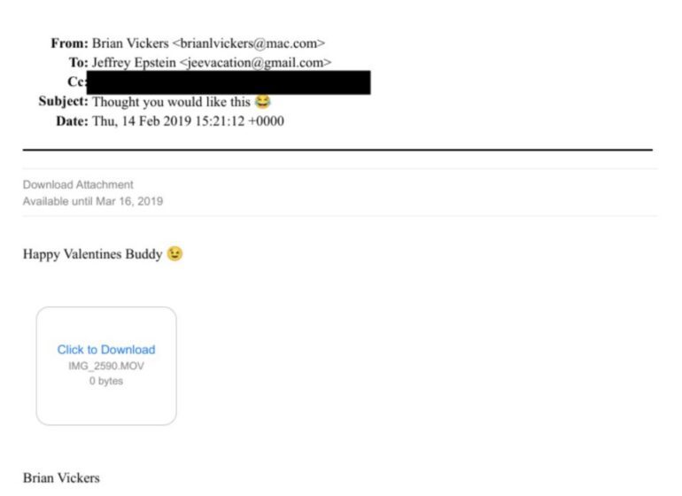 Le site affirme que les documents montreraient des courriels datant notamment de 2012 et 2013 évoquant Vickers et son environnement, ainsi qu’un message plus tardif envoyé en 2019. Whiskey Riff mentionne aussi l’existence d’une version de projet d’accord prénuptial et d’invitations à des événements de la NASCAR, éléments qu’il attribue au contenu de la publication fédérale.