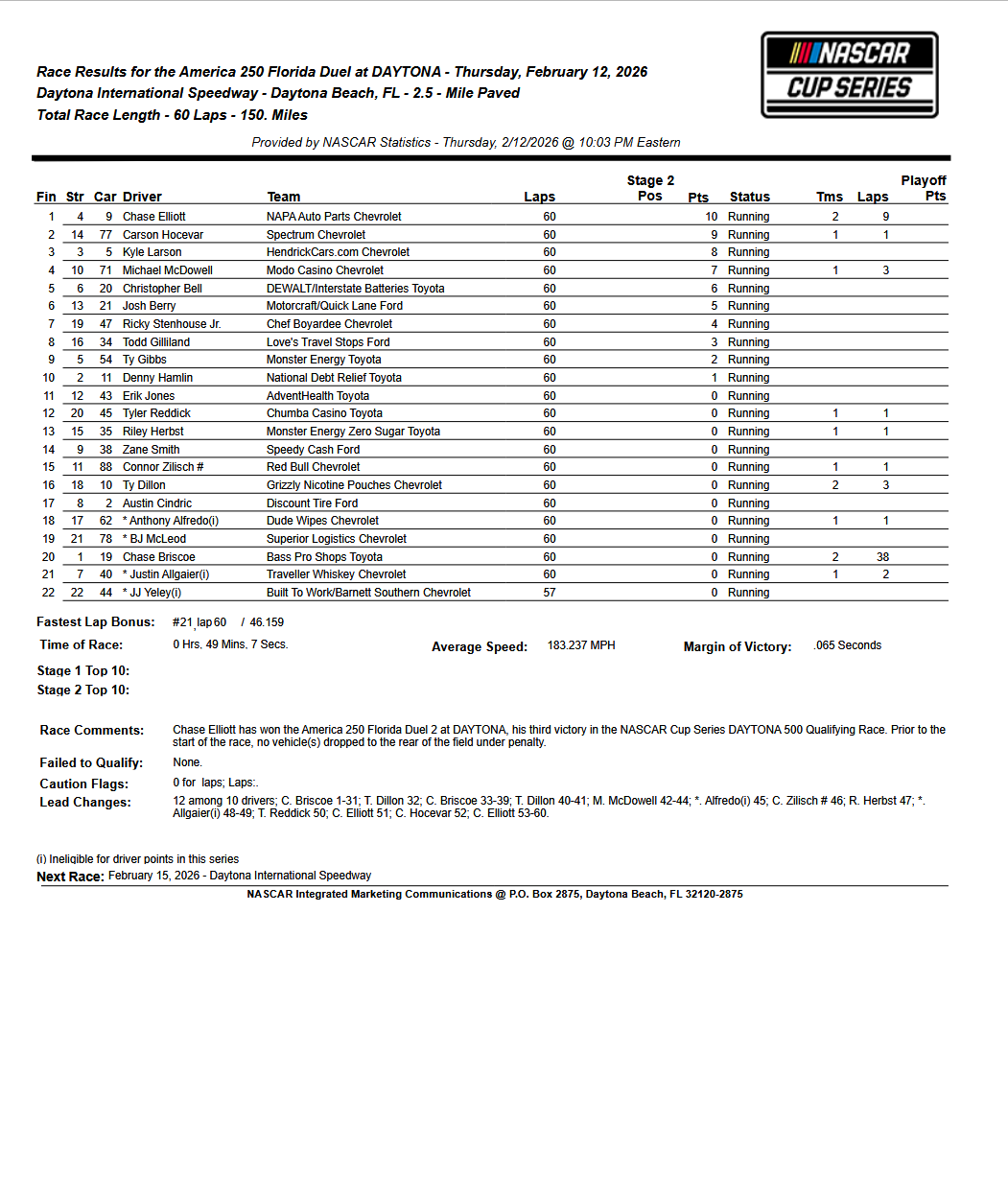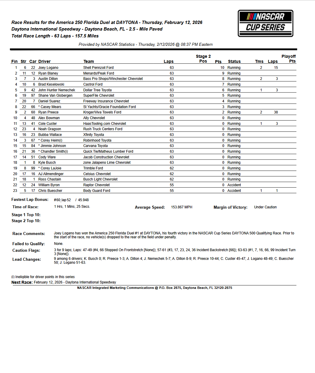 Sous le drapeau à damier, Joey Logano devance Ryan Blaney, Austin Dillon, Brad Keselowski, John Hunter Nemechek, Shane van Gisbergen, Daniel Suárez, Casey Meras, Ryan Preece et Alex Bowman pour le top 10.