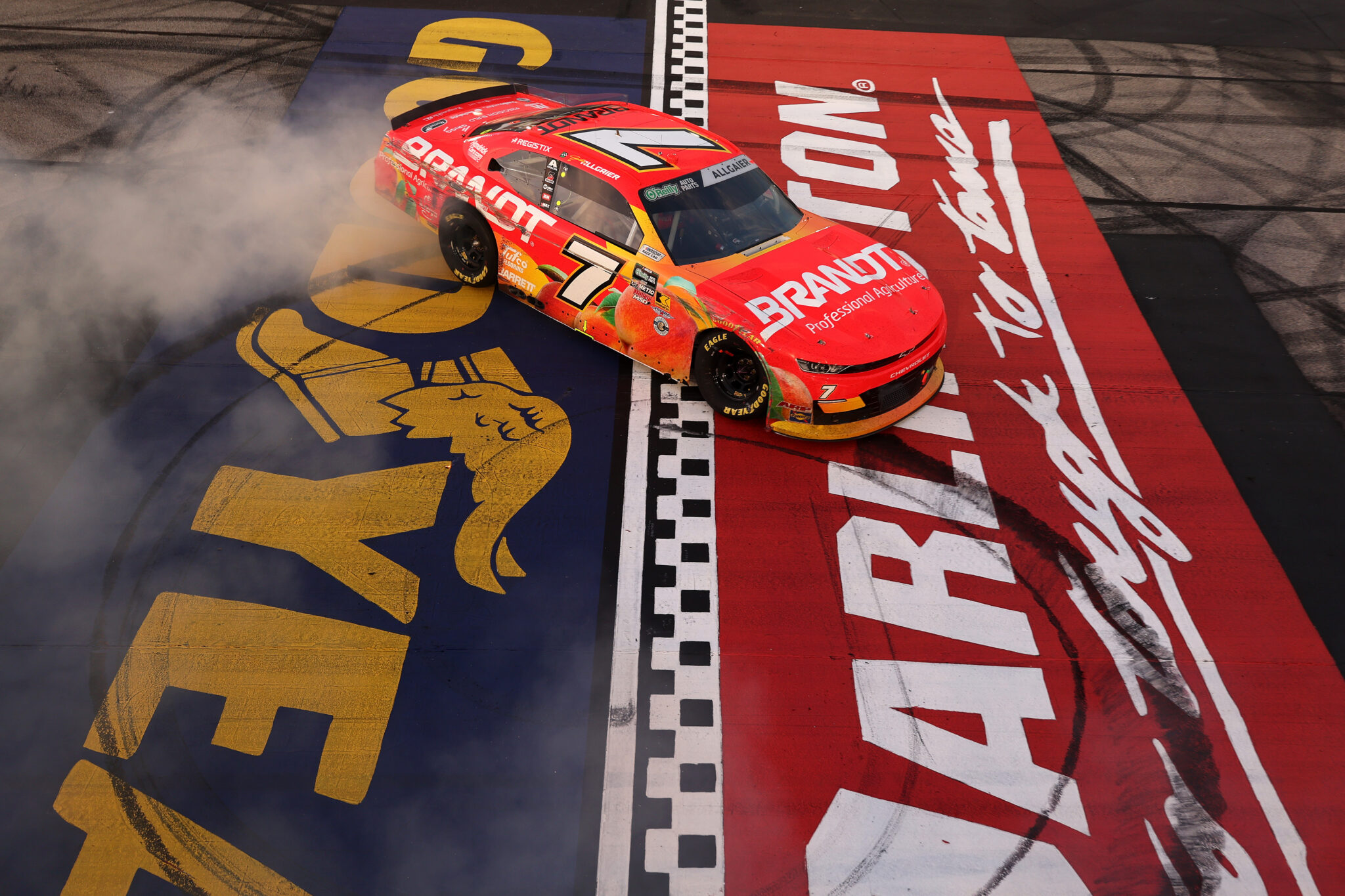 Le pilote de la n°7 a profité de l’arrêt aux stands médiocre de Kyle Larson lors de la dernière salve de ravitaillements pour prendre la tête de la course : côte-à-côte avec Brandon Jones au restart, il n’a eu qu’à enrouler le pilote Joe Gibbs racing par l’extérieur pour venir cueillir le drapeau à damiers.